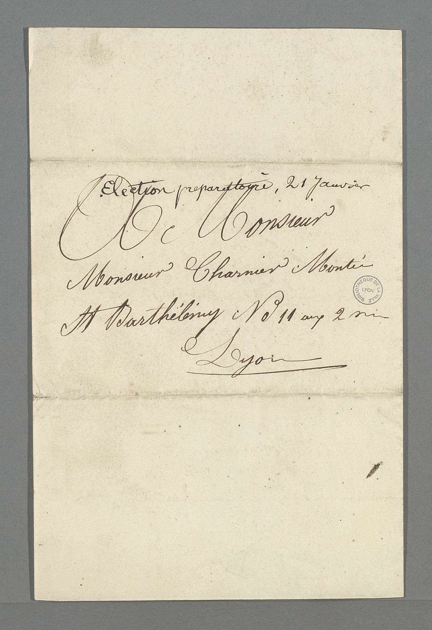 Convocation à la réunion préparatoire des électeurs chefs d'ateliers. Lyon (Rhône), lithographie Naegelin, dit Négli, rue Tramasse, 44 (Bibliothèque municipale de Lyon - Fonds ancien, MS_RUDE_375_f15-16)