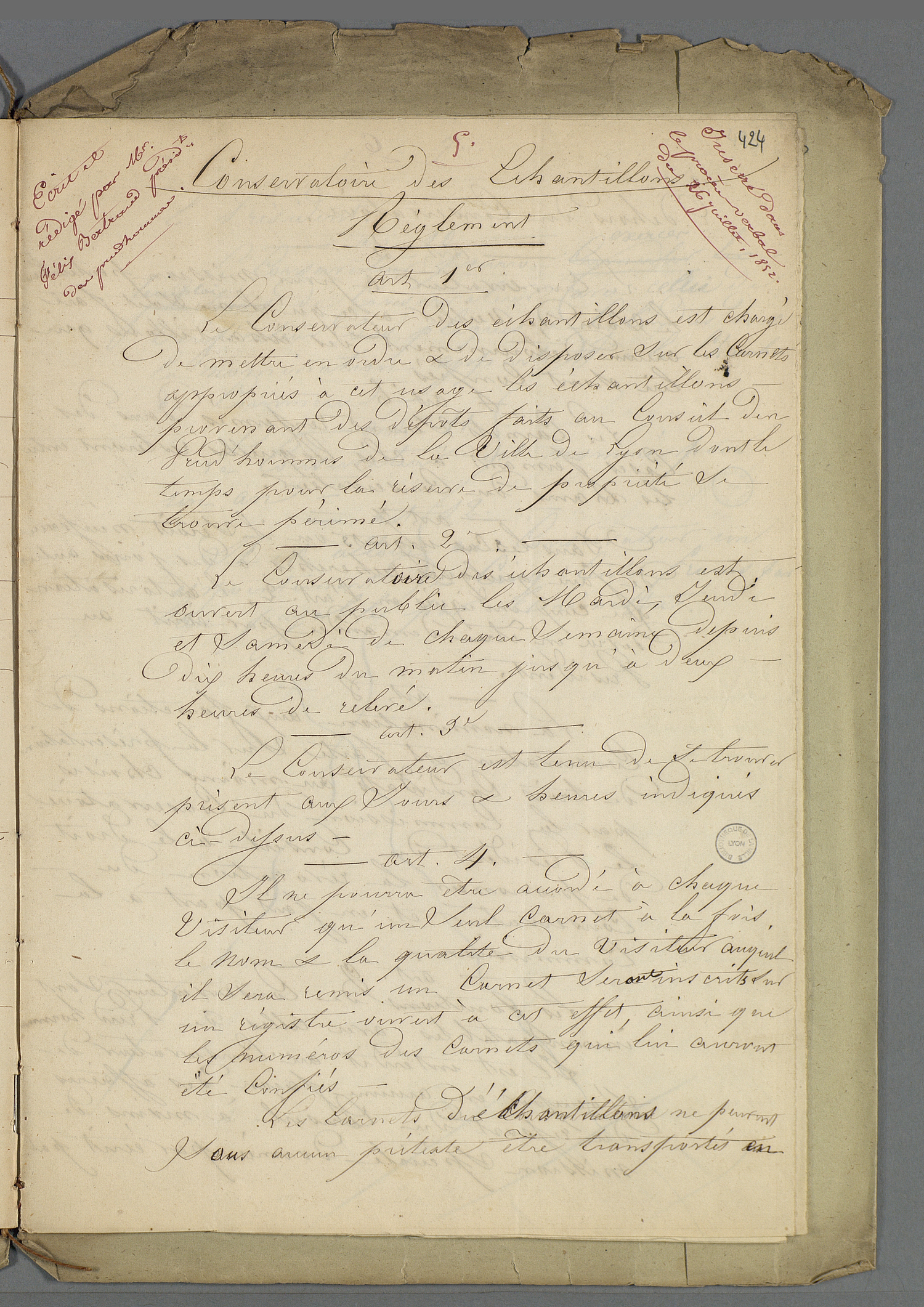 En folio 424, débute la déclinaison des 24 articles dudit règlement, écrit et rédigé par Félix Bertrand.