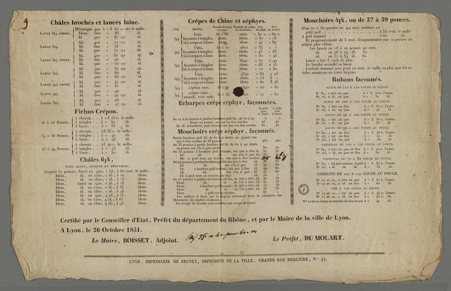 - Communiqué de la commission de chefs d'ateliers et des ouvriers concernant la lettre adressée l'avant-veille au préfet Bouvier-Dumolart concernant les réclamations sur le tarif minimum ainsi que sur le montage des métiers, publié dans le Journal du Commerce.