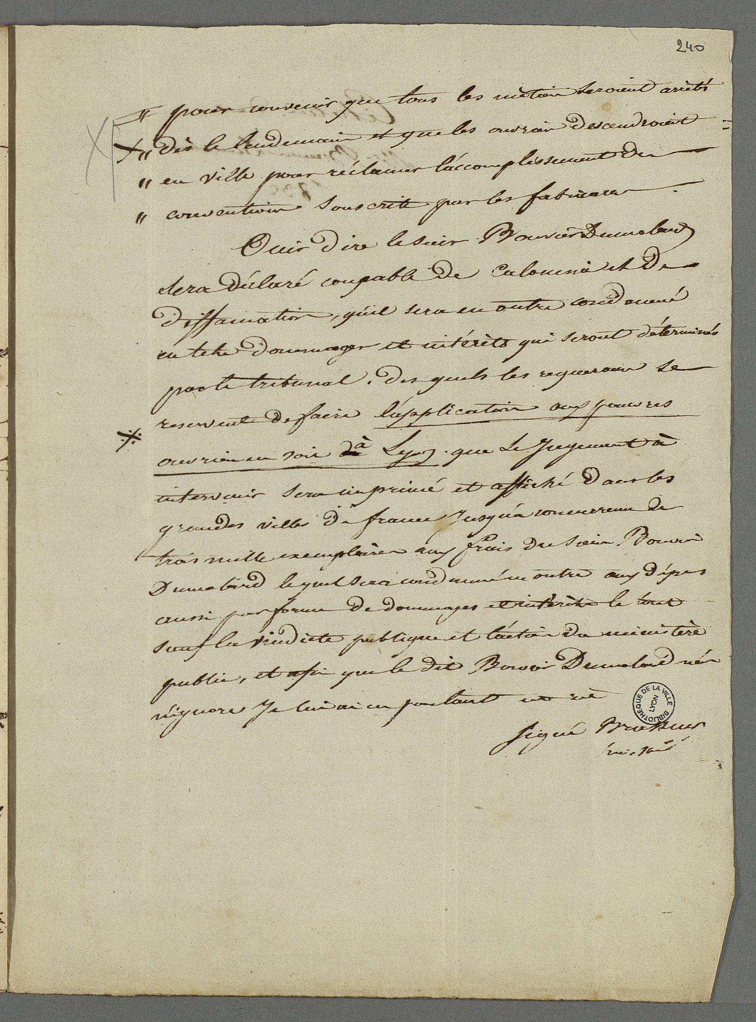 Citation du préfet Bouvier-Dumolart, dans le cadre du procès qui lui est intenté pour son rôle dans le déclenchement des événements de novembre 1831. (Bibliothèque municipale de Lyon - Fonds ancien, MS_RUDE_376_f237-240)
