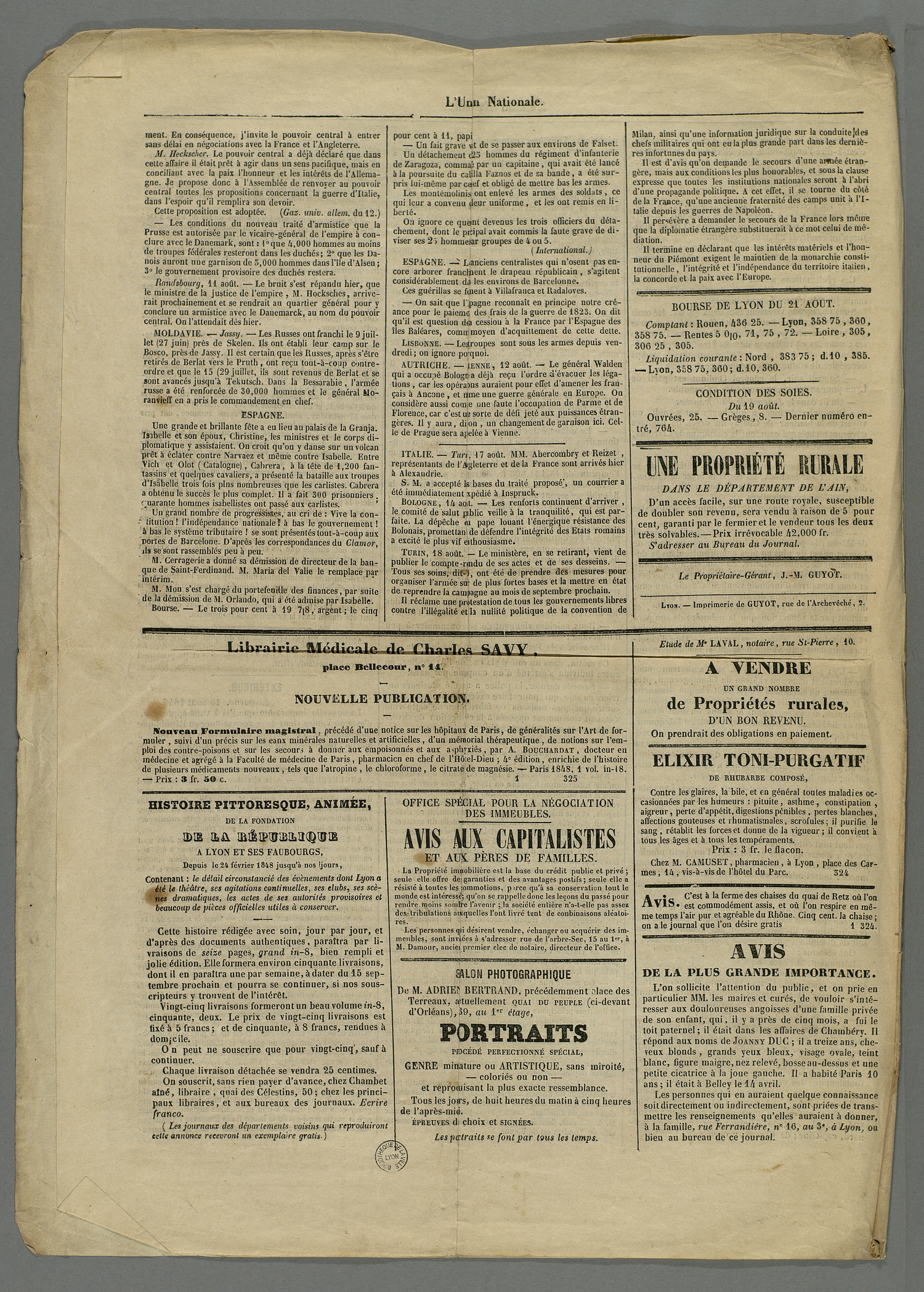 - Exemplaire du numéro 132 daté des 21 et 22 août 1848 du journal l'Union Nationale.