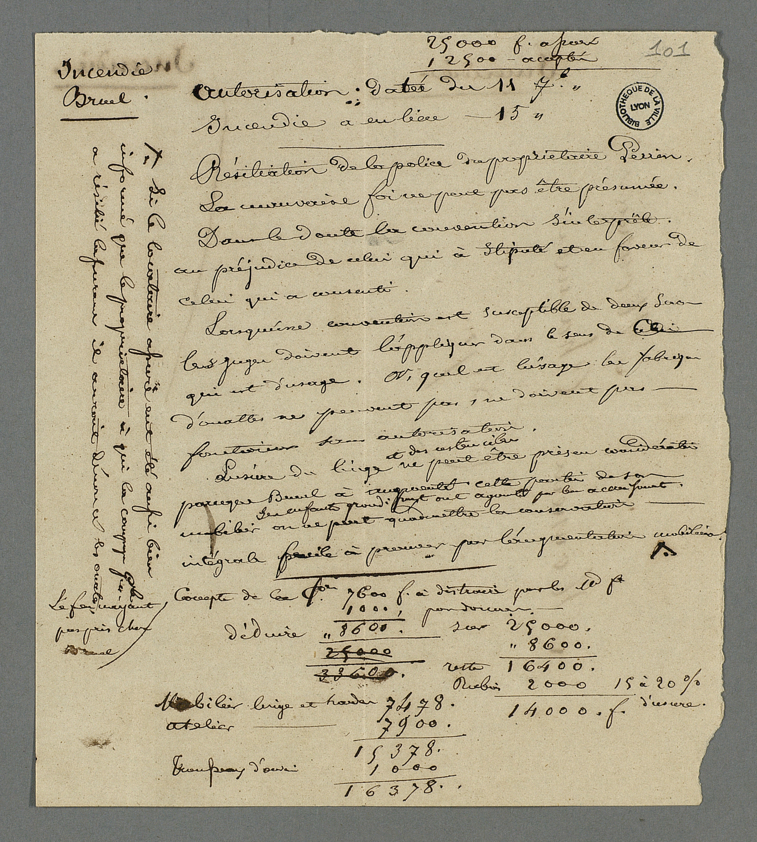Notes de l'enquête concernant l'indemnisation de Bruel suite à l'incendie de son domicile. (Bibliothèque municipale de Lyon - Fonds ancien, MS_RUDE_379_f100-103)