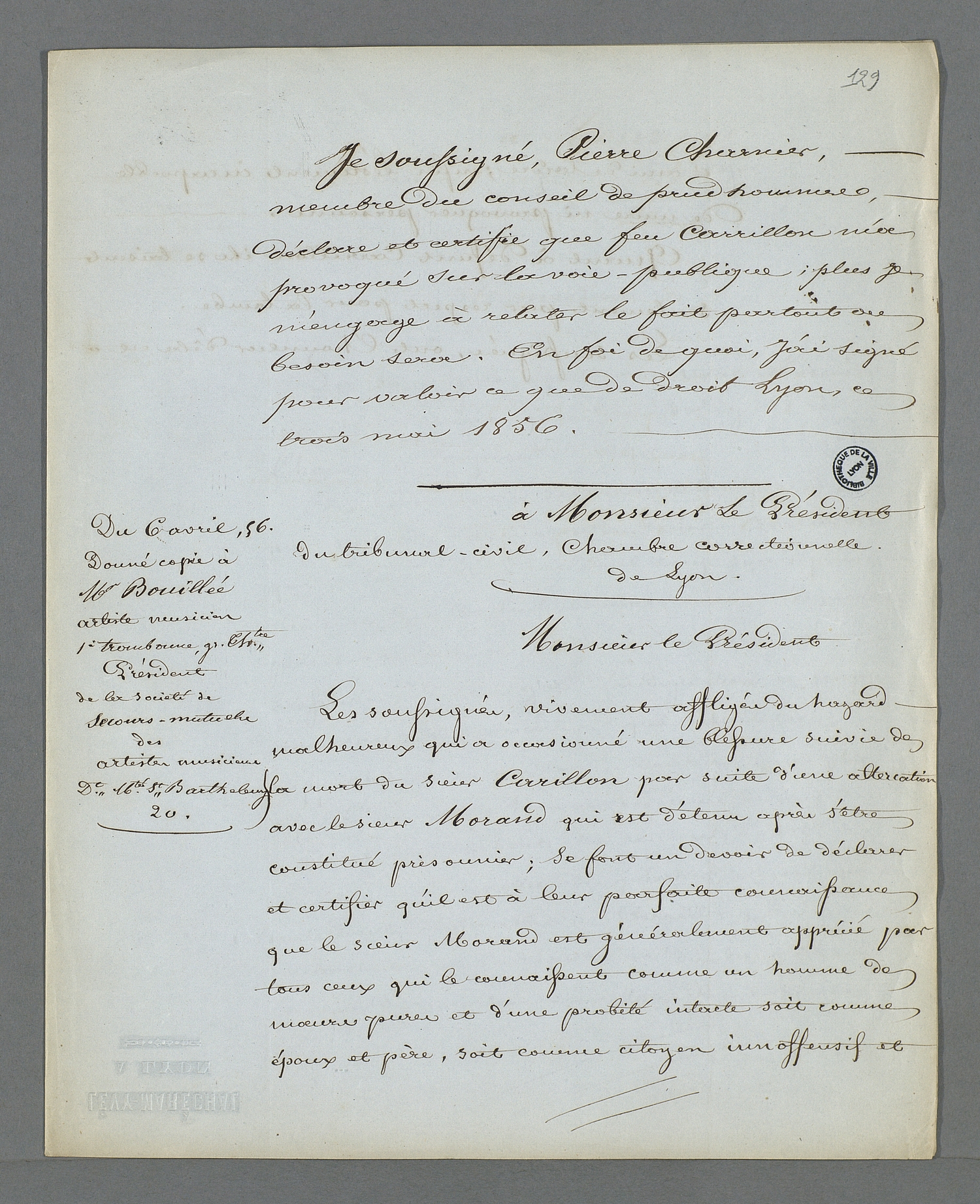 Au recto 2 se trouve le certificat de Pierre Charnier concernant la mauvaise conduite de Carillon, datée du , suivi d'un modèle de certificat attestant de la bonne moralité de Morand, dont Pierre Charnier a fourni une copie à Bouillée, président de la société de secours mutuel des artistes musiciens.