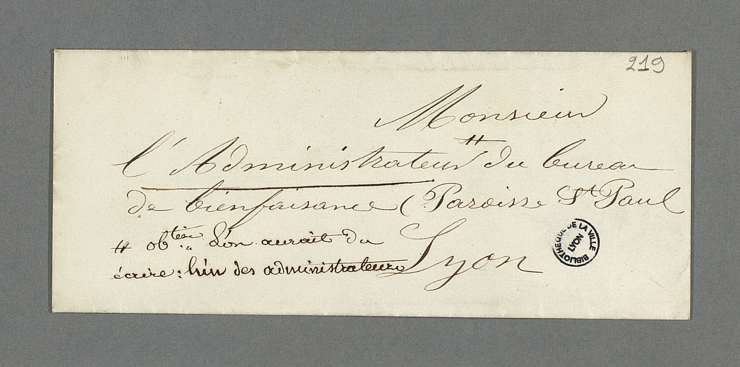 - Enveloppe adressée à Pierre Charnier, administrateur du quatorzième comité de bienfaisance.