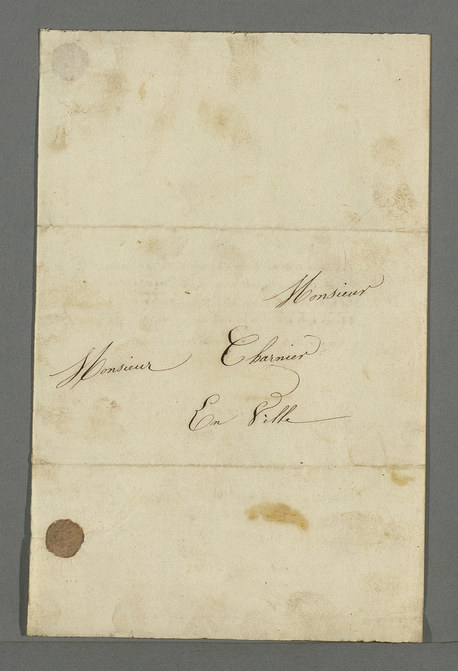 - Lettre du frère Casimir adressée à Pierre Charnier dans laquelle il lui demande de lui faire parvenir, par l'intermédiaire de Joubert, porteur de la lettre, les différentes pétitions qu'il lui avait transmises auparavant.