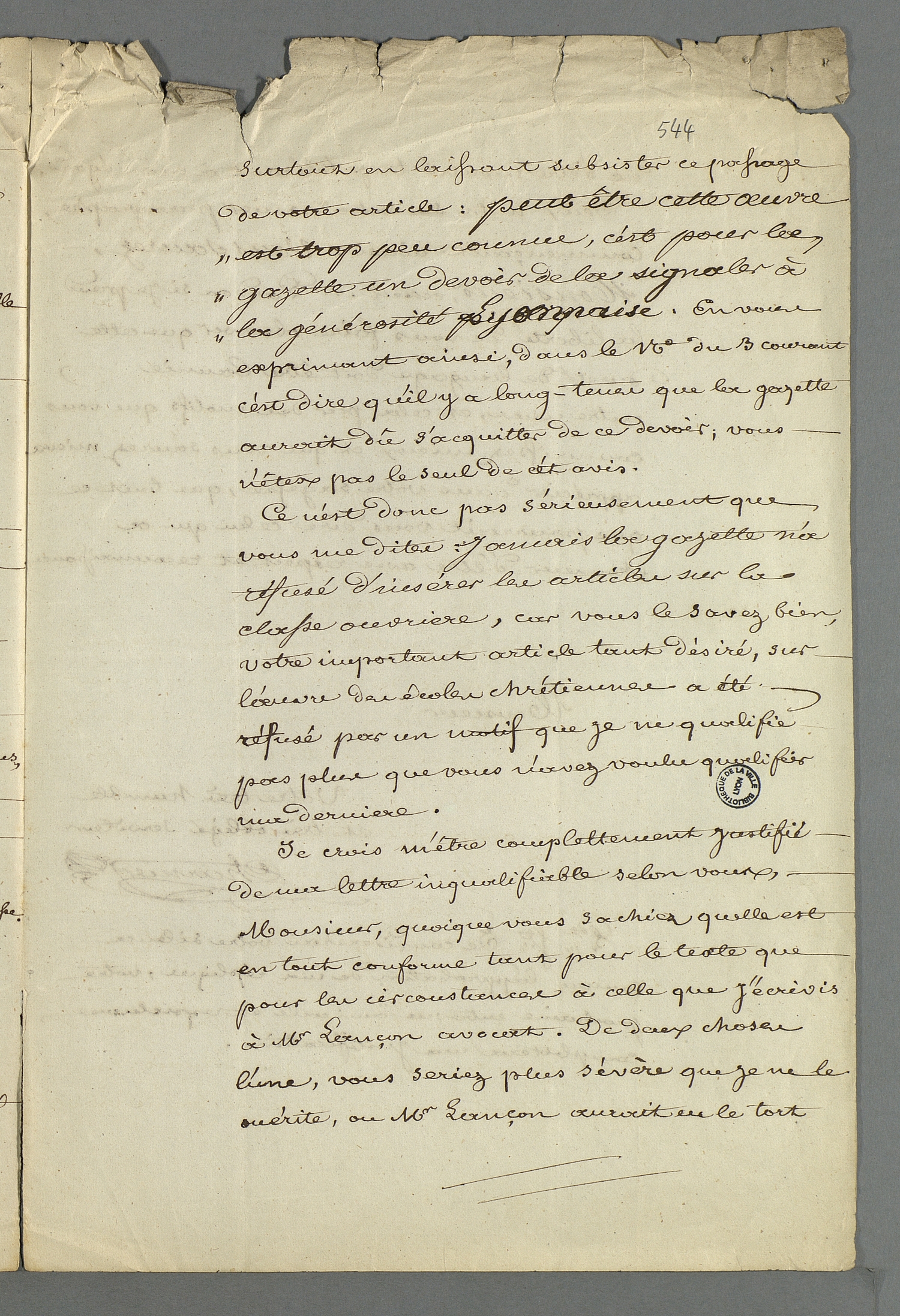 - Brouillon d'une lettre adressée au rédacteur du journal La Gazette de Lyon; Union Nationale,dans laquelle on l'informe des échanges houleux en réaction à l'article répertoriant les effectifs et les budgets des divers écoles de Lyon, publié dans le numéro daté du 18 avril 1851 du journal Le Courrier de Lyon.