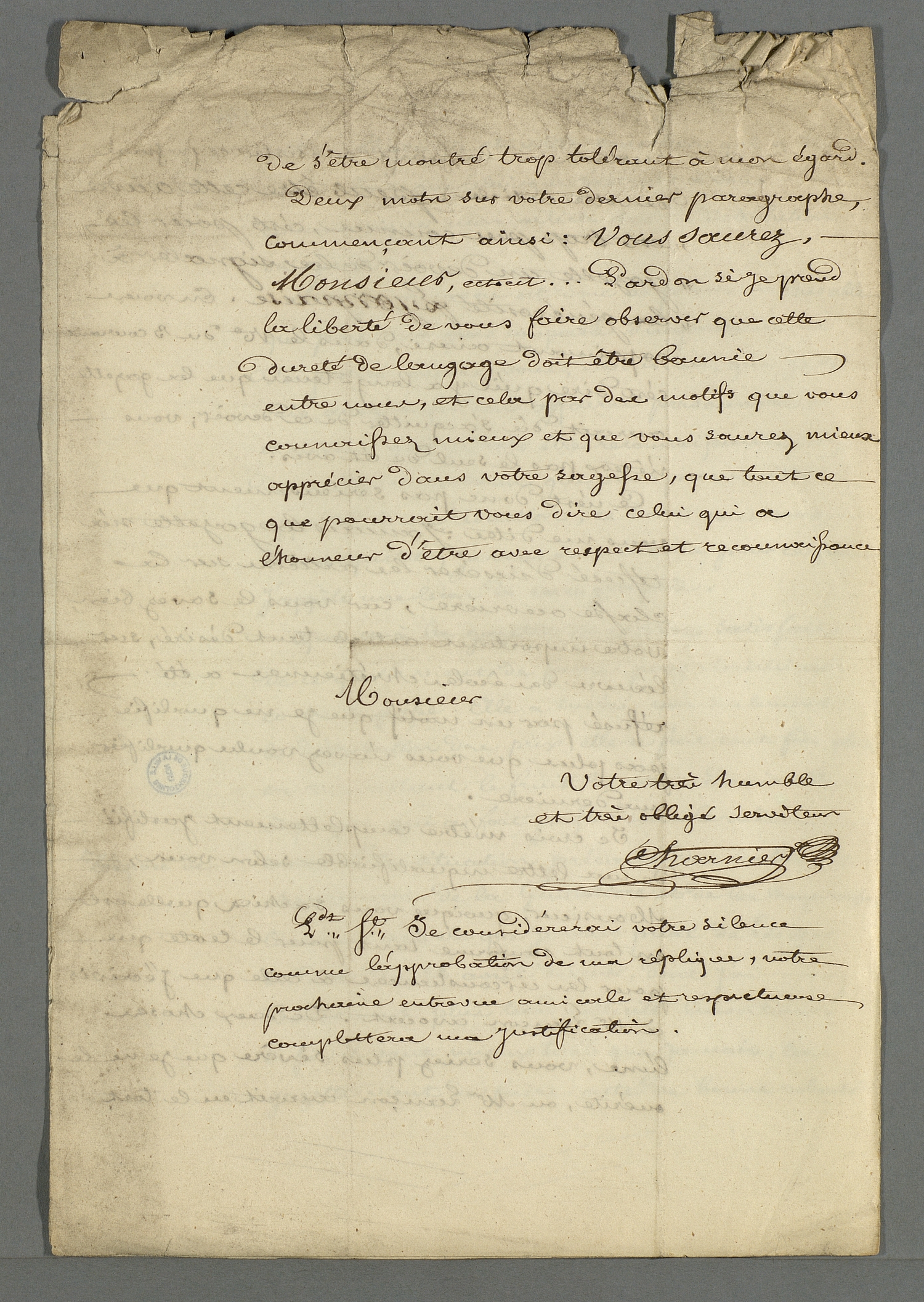 - Lettre de Pierre Charnier adressée au peintre Dolard, dans laquelle il l'entretient au sujet d'un tableau subversif peint par ce dernier.