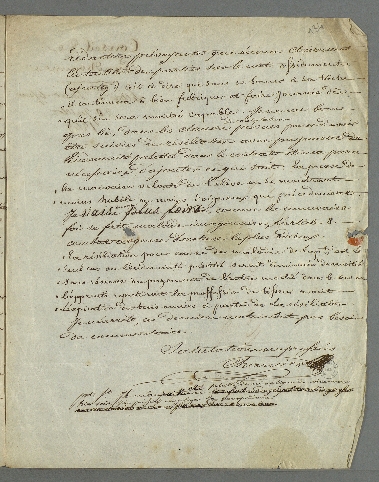 Lettre de Pierre Charnier adressée à son collègue prud'homme Perret, dans laquelle il l'entretient de la question des dispositions à adopter vis à vis des apprentis faisant preuve d'un ralentissement de productivité. (Bibliothèque municipale de Lyon - Fonds ancien, MS_RUDE_380_f133-134)