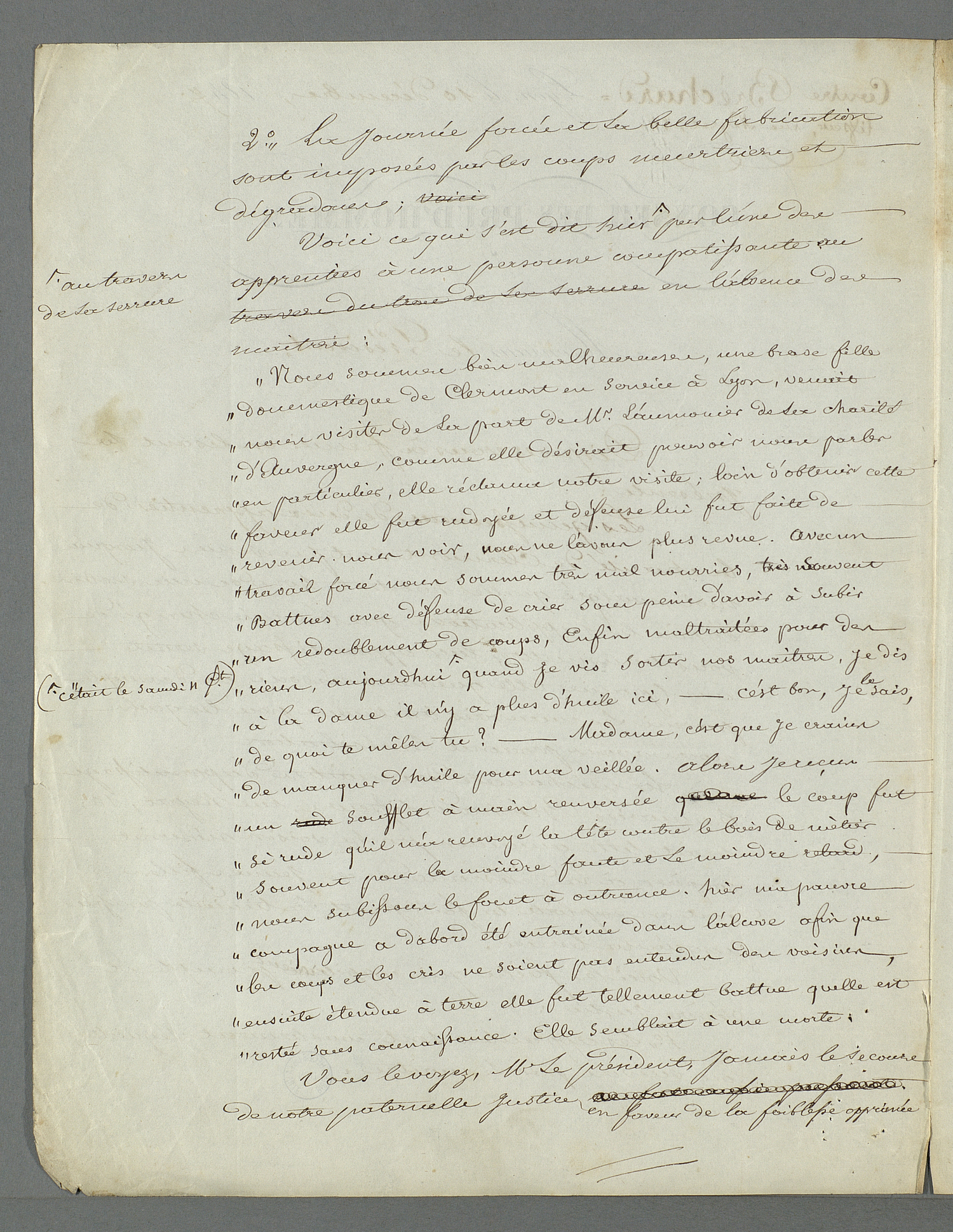 - Lettre de Pierre Charnier adressée à l'administrateur des hospices de Clermont, dans laquelle il lui relate les faits découverts au cours de l'enquête concernant les mauvais traitements subis par deux apprenties, Louise Forichon et Marie Berger, placées chez le tisseur Bréchard et son épouse par son instituion.