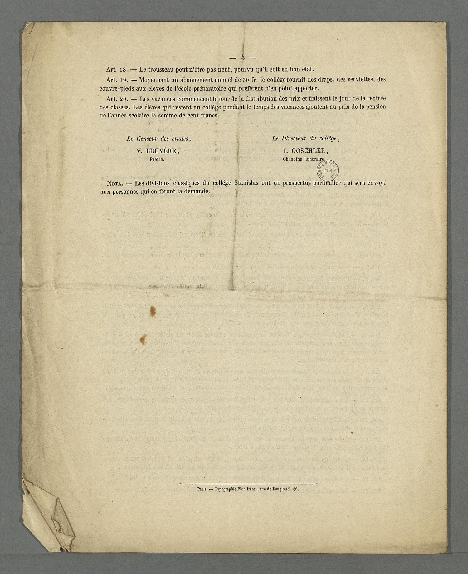 Brochure de présentation de l'école préparatoire aux grandes écoles du collège Stanislas. 1852 Paris (France), typographie Plon frères, rue de Vaugirard, 36. (Bibliothèque municipale de Lyon - Fonds ancien, MS_RUDE_380_f250)