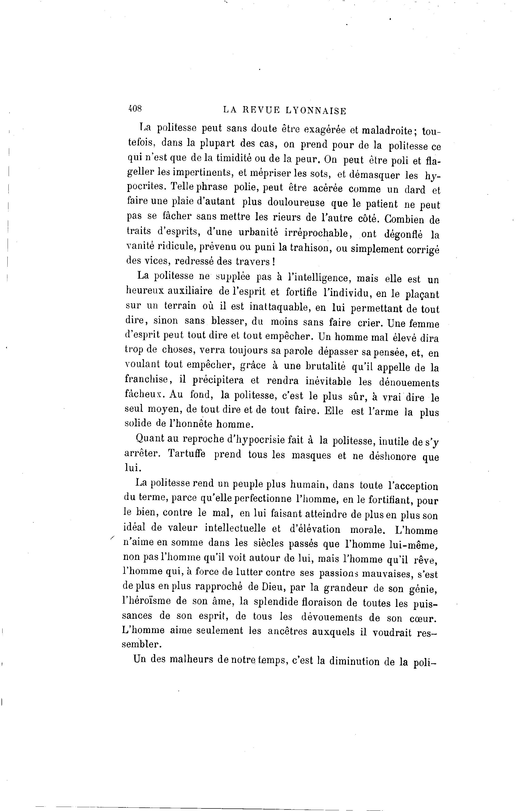 408 LA R E V U E LYONNAISE La politesse peut sans doute être exagérée et maladroite; tou- tefois, dans la plupart des cas, on prend pour de la politesse ce qui n'est que de la timidité ou de la peur. On peut être poli et fla- geller les impertinents, et mépriser les sots, et démasquer les hy- pocrites. Telle phrase polie, peut être acérée comme un dard et faire une plaie d'autant plus douloureuse que le patient ne peut pas se fâcher sans mettre les rieurs de l'autre côté. Combien de traits d'esprits, d'une urbanité irréprochable, ont dégonflé la vanité ridicule, prévenu ou puni la trahison, ou simplement corrigé des vices, redressé des travers ! La politesse ne supplée pas à l'intelligence, mais elle est un heureux auxiliaire de l'esprit et fortifie l'individu, en le plaçant sur un terrain où il est inattaquable, en lui permettant de tout dire, sinon sans blesser, du moins sans faire crier. Une femme d'esprit peut tout dire et tout empêcher. Un homme mal élevé dira trop de choses, verra toujours sa parole dépasser sa pensée, et, en voulant tout empêcher, grâce à une brutalité qu'il appelle de la franchise, il précipitera et rendra inévitable les dénouements fâcheux. Au fond, la politesse, c'est le plus sûr, à vrai dire le seul moyen, de tout dire et de tout faire. Elle est l'arme la plus solide de l'honnête homme. Quant au reproche d'hypocrisie fait à la politesse, inutile de s'y arrêter. Tartuffe prend tous les masques et ne déshonore que lui. La politesse rend un peuple plus humain, dans toute l'acception du terme, parce qu'elle perfectionne l'homme, en le fortifiant, pour le bien, contre le mal, en lui faisant atteindre de plus en plus son idéal de valeur intellectuelle et d'élévation morale. L'homme n'aime en somme dans les siècles passés que l'homme lui-même, non pas l'homme qu'il voit autour de lui, mais l'homme qu'il rêve, l'homme qui, à force de lutter contre ses passions mauvaises, s'est de plus en plus rapproché de Dieu, par la grandeur de son génie, l'héroïsme de son âme, la splendide floraison de toutes les puis- sances de son esprit, de tous les dévouements de son cœur. L'homme aime seulement les ancêtres auxquels il voudrait res- sembler. Un des malheurs de notre temps, c'est la diminution de la poli-