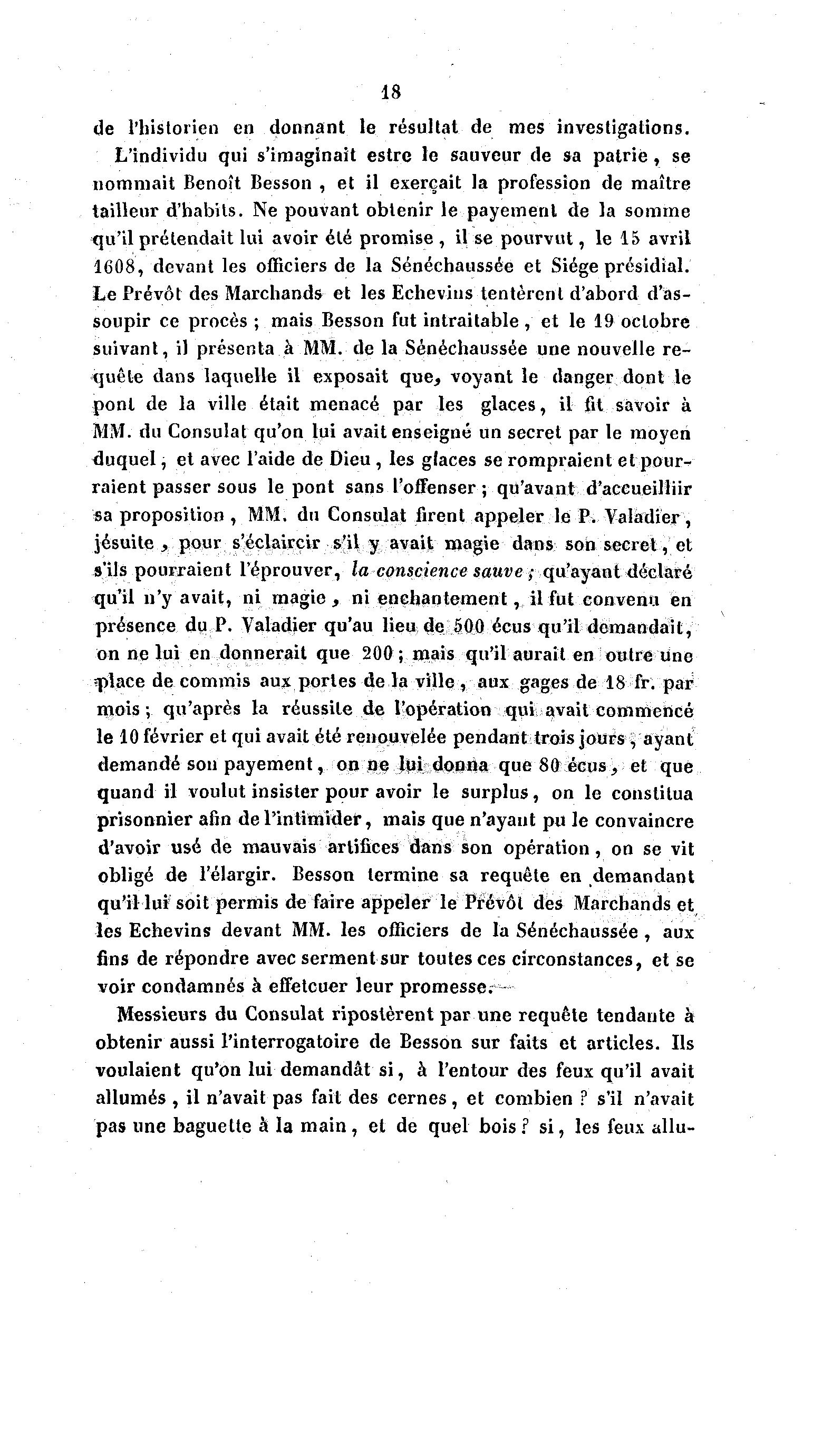 18 de l'historien en donnant le résultat de mes investigations. L'individu qui s'imaginait estre le sauveur de sa patrie, se nommait Benoît Besson , et il exerçait la profession de maître tailleur d'habits. Ne pouvant obtenir le payement de la somme qu'il prétendait lui avoir été promise , il se pourvut, le 15 avril 1608, devant les officiers de la Sénéchaussée et Siège présidial. Le Prévôt des Marchands et les Echevins tentèrent d'abord d'as- soupir ce procès ; mais Besson fut intraitable, et le 19 octobre suivant, il présenta à MM. de la Sénéchaussée une nouvelle re- quête dans laquelle il exposait que, voyant le danger dont le pont de la ville était menacé par les glaces, il fit savoir à MM. du Consulat qu'on lui avait enseigné un secret par le moyen duquel, et avec l'aide de Dieu , les glaces se rompraient et pour- raient passer sous le pont sans l'offenser ; qu'avant d'aceueilliir sa proposition , MM. du Consulat firent appeler le P. Valadier, jésuite , pour s'éclaircir s'il y avait magie dans son secret, et s'ils pourraient l'éprouver, la conscience sauve ; qu'ayant déclaré qu'il n'y avait, ni magie, ni enchantement, il fut convenu en présence du P. Valadier qu'au lieu de §00 écus qu'il demandait, on ne lui en donnerait que 200; mais qu'il aurait en outre une «place de commis aux portes de la ville , aux gages de 18 fr. par mois ; qu'après la réussite de l'opération qui; avait commencé le 10 février et qui avait été renouvelée pendant trois jours , ayant demandé son payement, on ne lui donna que 80 écus, et que quand il voulut insister pour avoir le surplus, on le constitua prisonnier afin de l'intimider, mais que n'ayant pu le convaincre d'avoir usé de mauvais artifices dans son opération, on se vit obligé de l'élargir. Besson termine sa requête en demandant qu'il lui soit permis de faire appeler le Prévôt des Marchands et les Echevins devant MM. les officiers de la Sénéchaussée , aux fins de répondre avec serment sur toutes ces circonstances, et se voir condamnés à effetcuer leur promesse;- Messieurs du Consulat ripostèrent par une requête tendante à obtenir aussi l'interrogatoire de Besson sur faits et articles. Ils voulaient qu'on lui demandât si, à l'entour des feux qu'il avait allumés , il n'avait pas fait des cernes, et combien ? s'il n'avait pas une baguette h la main, et de quel bois? si, les feux allu-