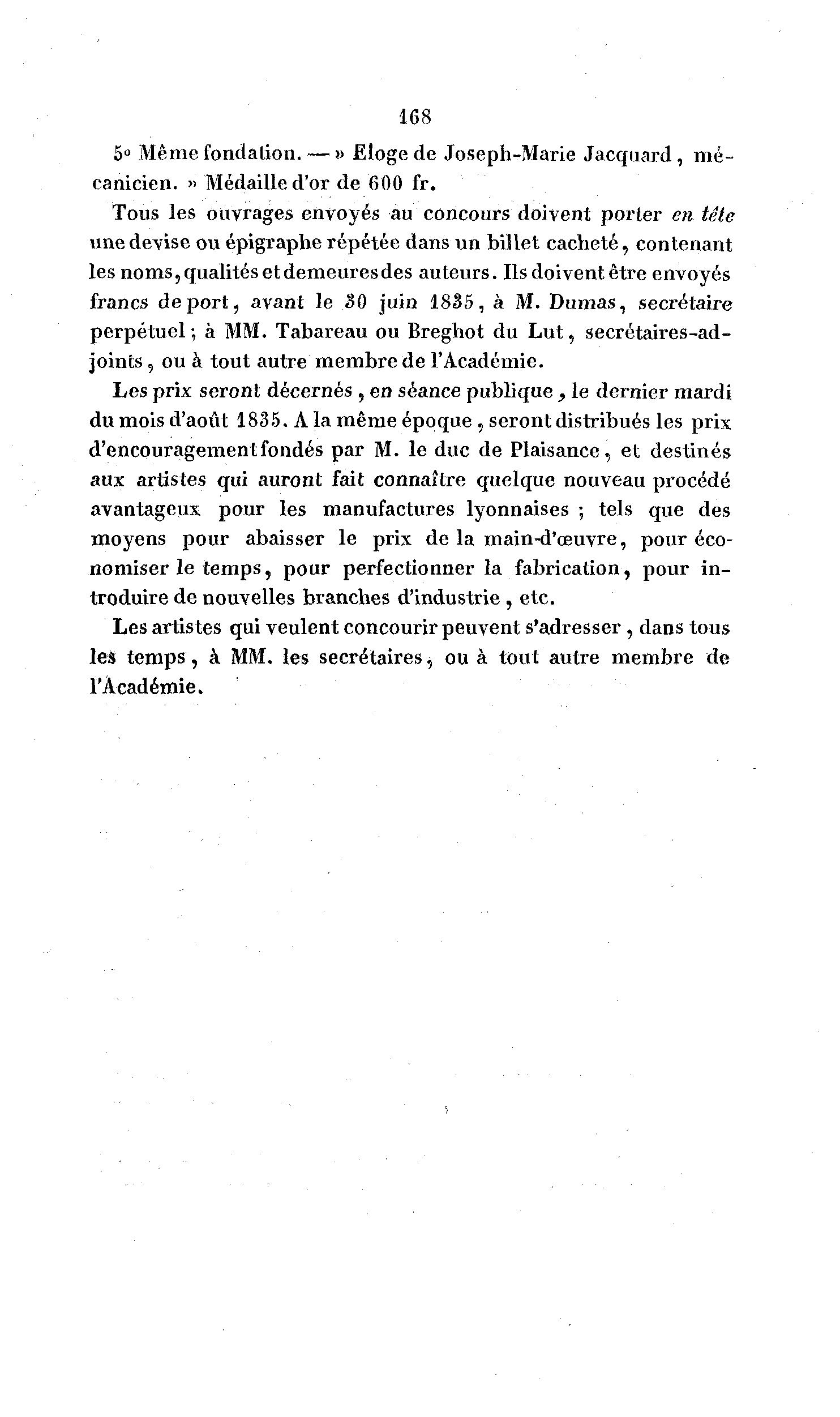 168 5° Même fondation. — » Eloge de Joseph-Marie Jacquard, m é - canicien. » Médaille d'or de 600 fr. Tous les ouvrages envoyés au concours doivent porter en tête une devise ou épigraphe répétée dans un billet cacheté, contenant les noms, qualités et demeures des auteurs. Ils doivent être envoyés francs d é p o r t , avant le 50 juin 1835, à M. Dumas, secrétaire p e r p é t u e l ; à MM. Tabareau ou Breghot du L u t , secrétaires-ad- joints , ou à tout autre membre de l'Académie. Les prix seront décernés , en séance publique , le dernier mardi du mois d'août 1835. A la même époque , seront distribués les prix d'encouragement fondés par M. le duc de Plaisance, et destinés aux artistes qui auront fait connaître quelque nouveau procédé avantageux pour les manufactures lyonnaises ; tels que des moyens pour abaisser le prix de la main-d'œuvre, pour éco- nomiser le t e m p s , pour perfectionner la fabrication, pour in- troduire de nouvelles branches d'industrie , etc. Les artistes qui veulent concourir peuvent s'adresser, dans tous les t e m p s , à MM. les secrétaires, ou à tout autre membre de l'Académie.