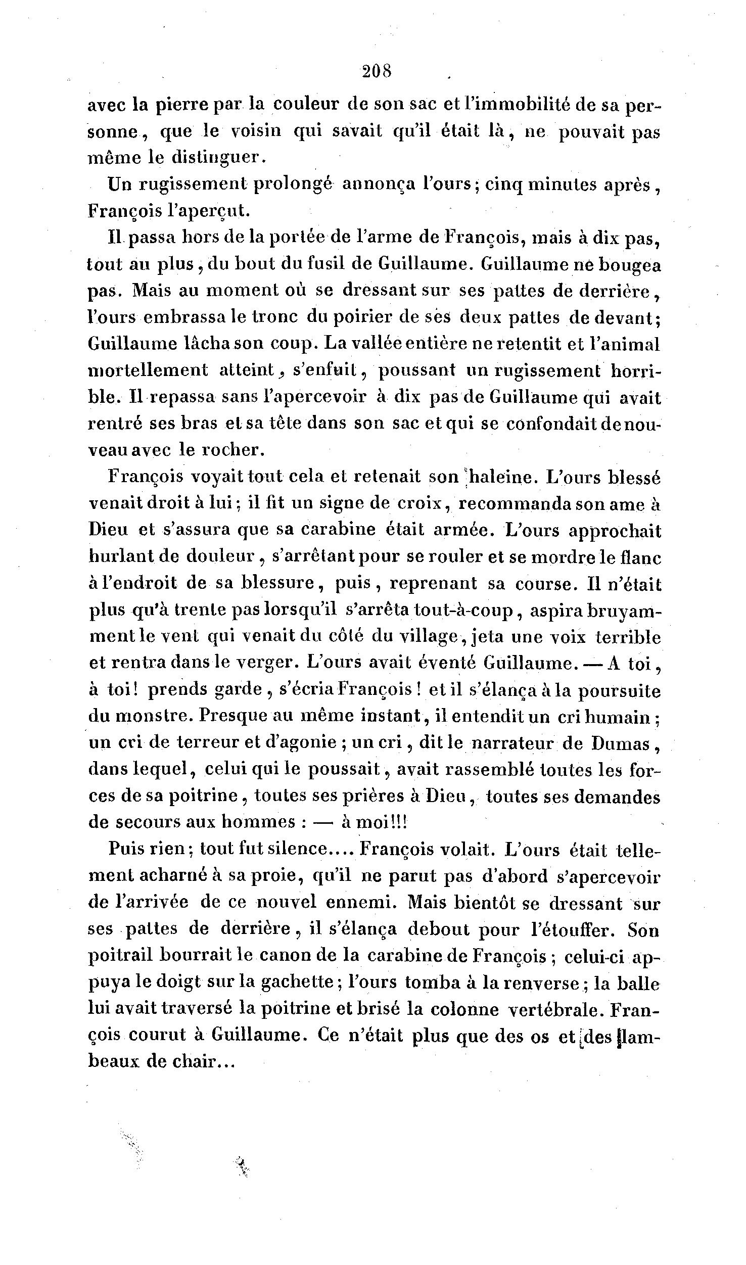 208 avec la pierre par la couleur de son sac et l'immobilité de sa per- sonne , que le voisin qui savait qu'il était l à , ne pouvait pas même le distinguer. Un rugissement prolongé annonça l'ours ; cinq minutes après , François l'aperçut. Il passa hors de la portée de l'arme de François, mais à dix pas, tout au plus , du bout du fusil de Guillaume. Guillaume ne bougea pas. Mais au moment où se dressant sur ses pattes de d e r r i è r e , l'ours embrassa le tronc du poirier de ses deux pattes de devant; Guillaume lâcha son coup. La vallée entière ne retentit et l'animal mortellement atteint^ s'enfuit, poussant un rugissement horri- ble. Il repassa sans l'apercevoir à dix pas de Guillaume qui avait rentré ses bras et sa tête dans son sac et qui se confondait de nou- veau avec le rocher. François voyait tout cela et retenait son "haleine. L'ours blessé venait droit à lui ; il fit un signe de croix, recommanda son ame à Dieu et s'assura que sa carabine était armée. L'ours approchait hurlant de d o u l e u r , s'arrêtantpour se rouler et se mordre le flanc à l'endroit de sa blessure, p u i s , reprenant sa course. Il n'était plus qu'à trente pas lorsqu'il s'arrêta tout-à -coup, aspira bruyam- ment le vent qui venait du côlé du village, jeta une voix terrible et rentra dans le verger. L'ours avait éventé Guillaume. — A t o i , à toi! prends garde, s'écria François ! et il s'élança à la poursuite du monstre. Presque au même instant, il entendit un cri humain ; un cri de terreur et d'agonie ; un c r i , dit le narrateur de Dumas , dans lequel, celui qui le poussait, avait rassemblé toutes les for- ces de sa poitrine, toutes ses prières à Dieu, toutes ses demandes de secours aux hommes : — à moi!!! Puis rien ; tout fut silence François volait. L'ours était telle- ment acharné à sa proie, qu'il ne parut pas d'abord s'apercevoir de l'arrivée de ce nouvel ennemi. Mais bientôt se dressant sur ses pattes de d e r r i è r e , il s'élança debout pour l'étouffer. Son poitrail bourrait le canon de la carabine de François ; celui-ci ap- puya le doigt sur la gâchette ; l'ours tomba à la renverse ; la balle lui avait traversé la poitrine et brisé la colonne vertébrale. Fran- çois courut à Guillaume. Ce n'était plus que des os et [des flam- beaux de chair...