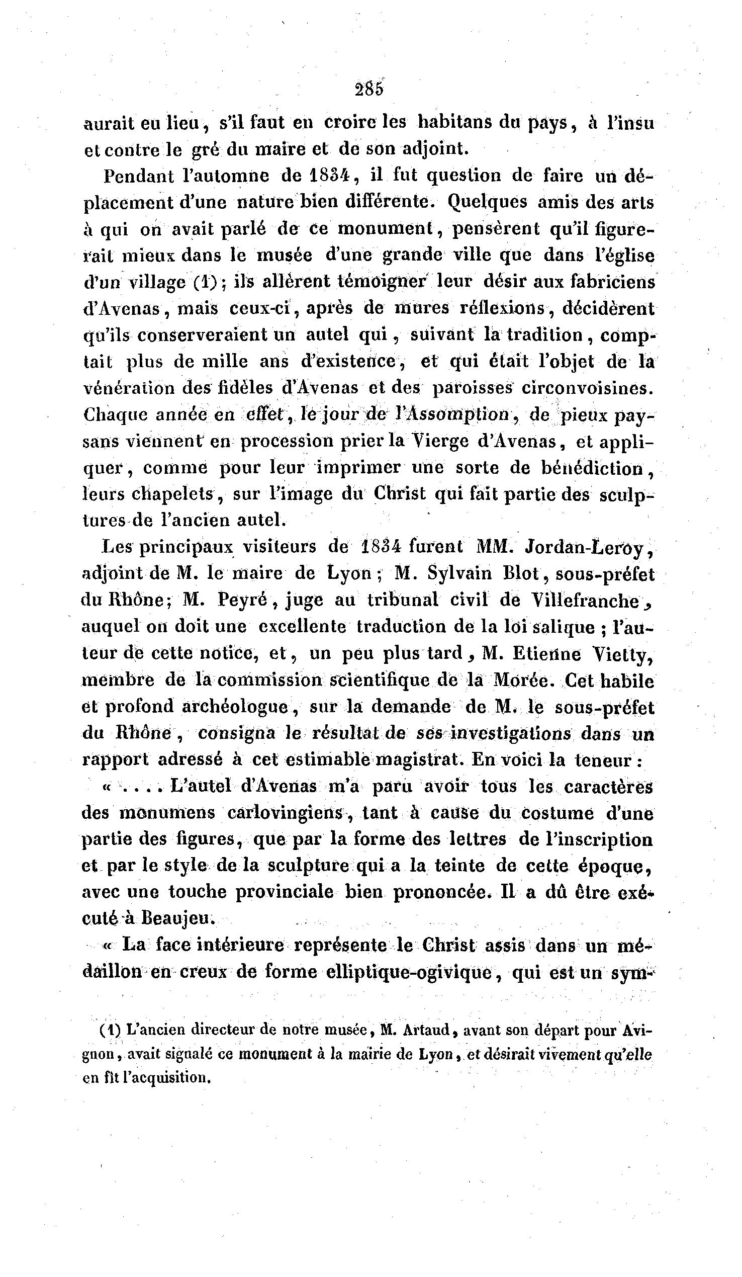 285 aurait eu lieu, s'il faut en croire les habitans du pays, à l'insu et contre le gré du maire et de son adjoint. Pendant l'automne de 1834, il fut question de faire un dé- placement d'une nature bien différente. Quelques amis des arts à qui on avait parlé de Ce monument, pensèrent qu'il figure- rait mieux dans le musée d'une grande ville que dans l'église d'un village (1) ; ils allèrent témoigner leur désir aux fabriciens d'Avenas, mais ceux-ci, après de mures réflexions, décidèrent qu'ils conserveraient un autel q u i , suivant là tradition , comp- tait plus de mille ans d'existence, et qui était l'objet de la vénération des fidèles d'Avenas et dos paroisses circonvoisines. Chaque année en effet, le jour de l'Assomption, de pieux pay- sans viennent en procession prier la Vierge d'Avenas, et appli- quer, comme pour leur imprimer une sorte de bénédiction, leurs chapelets, sur l'image du Christ qui fait partie des sculp- tures de l'ancien autel. Les principaux visiteurs de 1834 furent MM. Jordan-Leroy, adjoint de M. ternaire de Lyon; M. Sylvain Blot, sous-préfet du Rhône; M. Peyré, juge au tribunal civil de Yillefranche., auquel on doit une excellente traduction de la loi salique ; l'au- teur de cette notice, e t , un peu plus tard, M. Etiertne Viet'ty, membre de la commission scientifique dé la Morée. Cet habile et profond archéologue, sur la demande de M, le sous-préfet du Rhône, consigna le résultat de ses investigations dans un rapport adressé à cet estimable magistrat. En voici la teneur : « . . . . L'autel d'Avenas m'a paru avoir tous les caractères des monumens cârlovingiens, tant à cause du costumé d'une partie des figures, que par la forme des lettres de l'inscription et par le style de la sculpture qui a la teinte de cette époque, avec une touche provinciale bien prononcée. Il a dû être exé* cutéà Beaujeu. « La face intérieure représente le Christ assis dans un mé- daillon en creux de forme elliptique-ogivlque, qui est un sytn- ( 1) L'ancien directeur de notre musée, M. Artaud, avant son départ pour Avi- gnon, avait signalé ce monument à la mairie de Lyon, et désirait vivement qu'elle en fît l'acquisition.