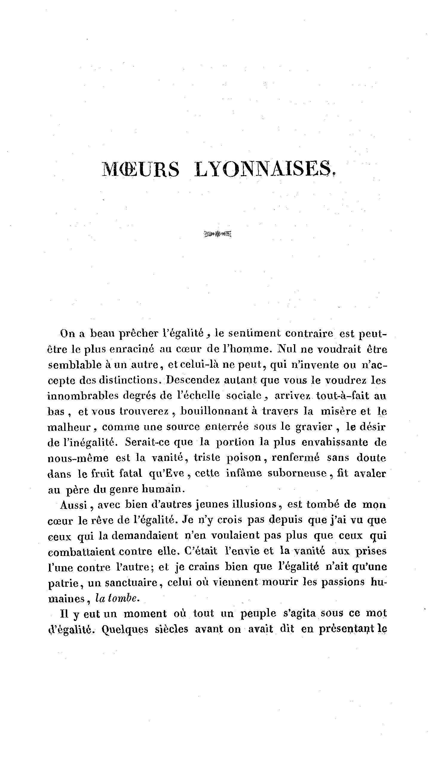 M(KURS LYONNAISES, *»#«: On a beau prêcher l'égalité , le sentiment contraire est peut- être le plus enraciné au cœur de l'homme. Nul ne voudrait être semblable à un a u t r e , et celui-là ne p e u t , qui n'invente ou n'ac- cepte des distinctions. Descendez autant que vous le voudrez les innombrables degrés de l'échelle sociale, arrivez tout-à -fait au bas , et vous trouverez , bouillonnant à travers la misère et le m a l h e u r , comme une source enterrée sous le gravier , le désir de l'inégalité. Serait-ce que la portion la plus envahissante de nous-même est la vanité, triste poison, renfermé sans doute dans le fruit fatal qu'Eve , cette infâme suborneuse , fit avaler au père du genre humain. Aussi, avec bien d'autres jeunes illusions, est tombé de mon cœur le rêve de l'égalité. Je n'y crois pas depuis que j'ai vu que ceux qui la demandaient n'en voulaient pas plus que ceux qui combattaient contre elle. C'était l'envie et la vanité aux prises l'une contre l'autre; et je crains bien que l'égalité n'ait qu'une patrie, un sanctuaire, celui où viennent mourir les passions hu- maines , la tombe. Il y eut un moment où tout un peuple s'agita sous ce mot d'égalité. Quelques siècles avant on avait dit en présentant le