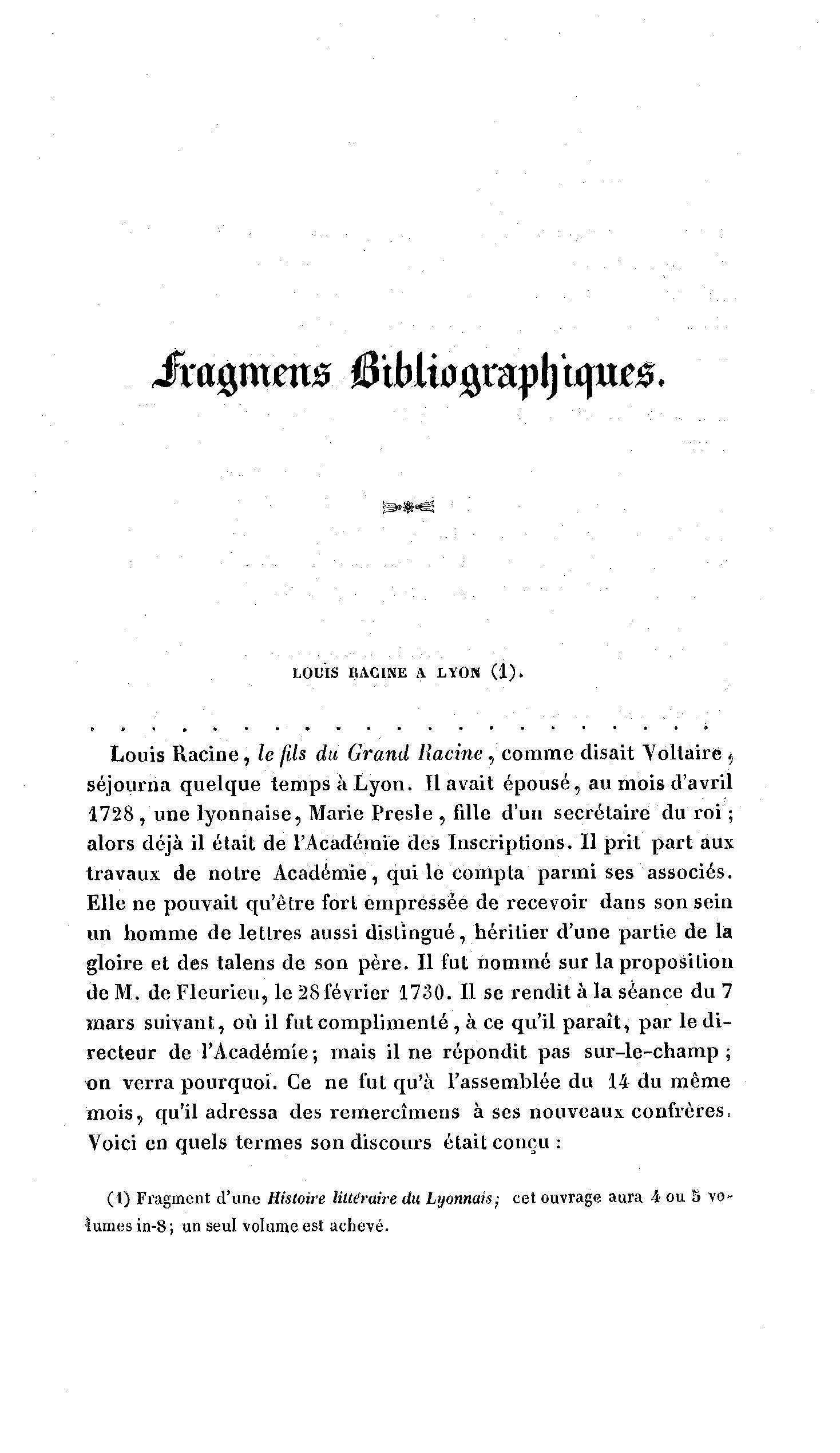 (1) Fragment d'une Histoire litldraire du Lyonnais; cet ouvrage aura 4 ou 5 vo-