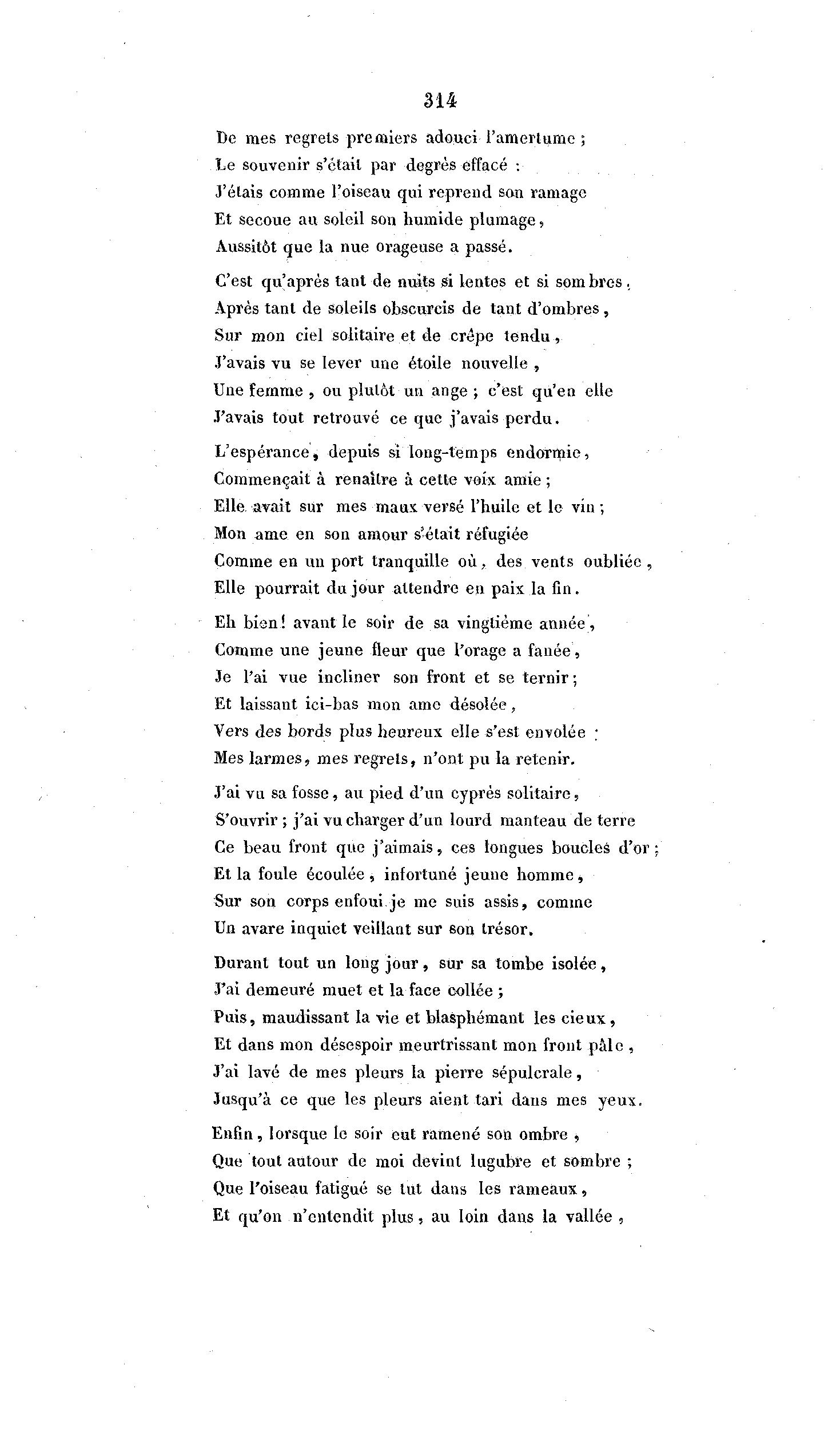 314 De mes regrets premiers adouci l'amertume ; Le souvenir s'était par degrés effacé : J'étais comme l'oiseau qui reprend son ramage Et secoue au soleil son humide plumage, Aussitôt que la nue orageuse a passé. C'est qu'après tant de nuits si lentes et si sombres . Après tant de soleils obscurcis de tant d'ombres, Sur mon ciel solitaire et de crêpe tendu, J'avais vu se lever une étoile nouvelle , Une femme , ou plutôt un ange ; c'est qu'eu elle J'avais tout retrouvé ce que j'avais perdu. L'espérance, depuis si long-temps endormie, Commençait à renaître à cette voix amie ; Elle, avait sur mes maux versé l'huile et le vin ; Mon ame en son amour s'était réfugiée Comme en un port tranquille où, des vents oubliée , Elle pourrait du jour attendre en paix la fin. Eh bien! avant le soir de sa vingtième année, Comme une jeune fleur que l'orage a fanée, Je l'ai vue incliner son front et se ternir ; Et laissant ici-bas mon ame désolée, Vers des bords plus heureux elle s'est envolée ; Mes larmes, mes regrets, n'ont pu la retenir. J'ai vu sa fosse, au pied d'un cyprès solitaire, S'ouvrir ; j'ai vu charger d'uu lourd manteau de terre Ce beau front que j'aimais, ces longues boucles d'or: Et la foule écoulée , infortuné jeune homme, Sur son corps enfoui.je me suis assis, comme Un avare inquiet veillant sur son trésor. Durant tout un long jour, sur sa tombe isolée, J'ai demeuré muet et la face collée ; Puis, maudissant la vie et blasphémant les cie ux, Et dans mon désespoir meurtrissant mon front pâle , J'ai lavé de mes pleurs la pierre sépulcrale, Jusqu'à ce que les pleurs aient tari dans mes yeux. Enfin, lorsque le soir eut ramené son ombre , Que tout autour de moi devint lugubre et sombre ; Que l'oiseau fatigué se tut dans les rameaux, Et qu'on n'entendit plus, au loin dans la vallée ,