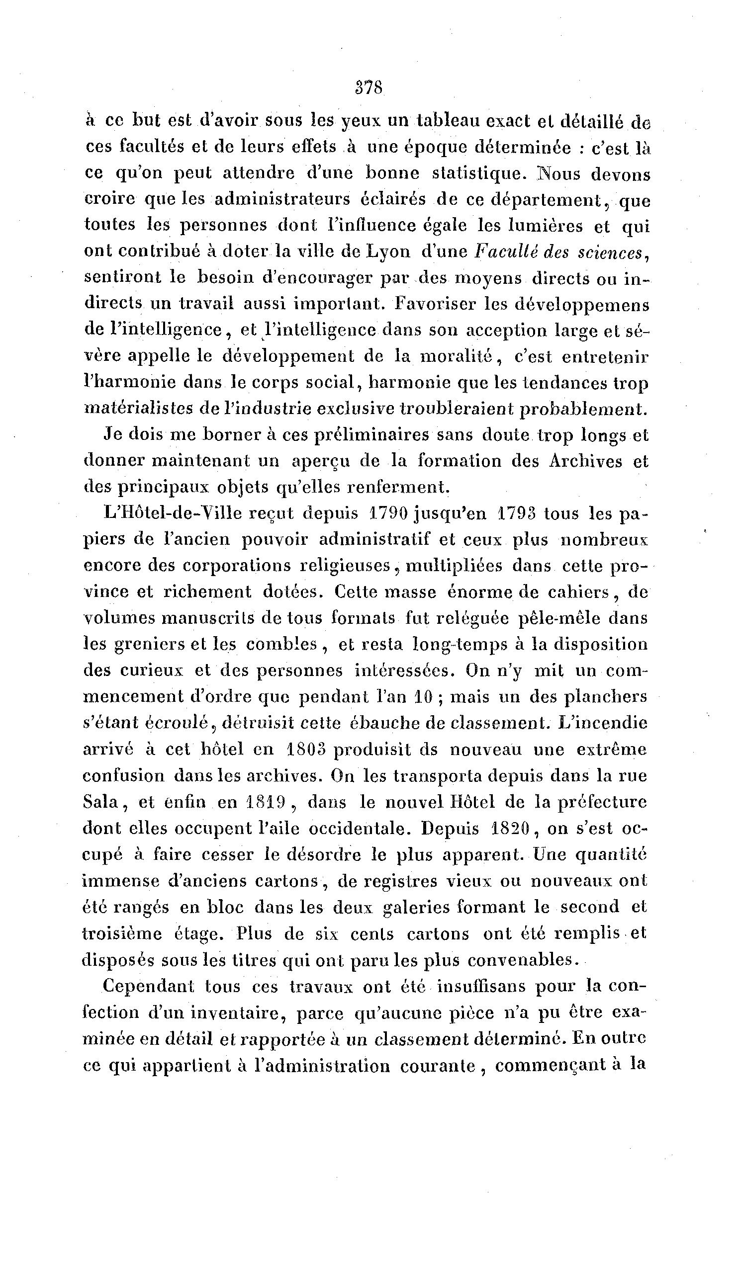 378 à ce but est d'avoir sous les yeux un tableau exact et détaillé de ces facultés et de leurs effets à une époque déterminée : c'est là ce qu'on peut attendre d'une bonne statistique. Nous devons croire que les administrateurs éclairés de ce département, que toutes les personnes dont l'influence égale les lumières et qui ont contribué à doter la ville de Lyon d'une Faculté des sciences, sentiront le besoin d'encourager par des moyens directs ou in- directs un travail aussi important. Favoriser les développemens de l'intelligence, et l'intelligence dans sou acception large et sé- vère appelle le développement de la moralité, c'est entretenir l'harmonie dans le corps social, harmonie que les tendances trop matérialistes de l'industrie exclusive troubleraient probablement. Je dois me borner à ces préliminaires sans doute trop longs et donner maintenant un aperçu de la formation des Archives et des principaux objets qu'elles renferment. L'Hôtel-de-Ville reçut depuis 1790 jusqu'en 1798 tous les pa- piers de l'ancien pouvoir administratif et ceux plus nombreux encore des corporations religieuses, multipliées dans cette p r o - vince et richement dotées. Cette masse énorme de cahiers, de volumes manuscrits de tous formats fut reléguée pêle-mêle dans les greniers et les combles , et resta long-temps à la disposition des curieux et des personnes intéressées. On n'y mit un com- mencement d'ordre que pendant l'an 10 ; mais un des planchers s'étant écroulé, détruisit cette ébauche de classement. L'incendie arrivé à cet hôtel en 1803 produisit ds nouveau une extrême confusion dans les archives. On les transporta depuis dans la rue Sala, et enfin en 1819, dans le nouvel Hôtel de la préfecture dont elles occupent l'aile occidentale. Depuis 1820, on s'est oc- cupé à faire cesser le désordre le plus apparent. Une quantité immense d'anciens cartons, de registres vieux ou nouveaux ont été rangés en bloc dans les deux galeries formant le second et troisième étage. Plus de six cents cartons ont été remplis et disposés sous les titres qui ont paru les plus convenables. Cependant tous ces travaux ont été insuiïisans pour la con- fection d'un inventaire, parce qu'aucune pièce n'a pu être exa- minée en détail et rapportée à un classement déterminé. En outre ce qui appartient à l'administration courante , commençant à la