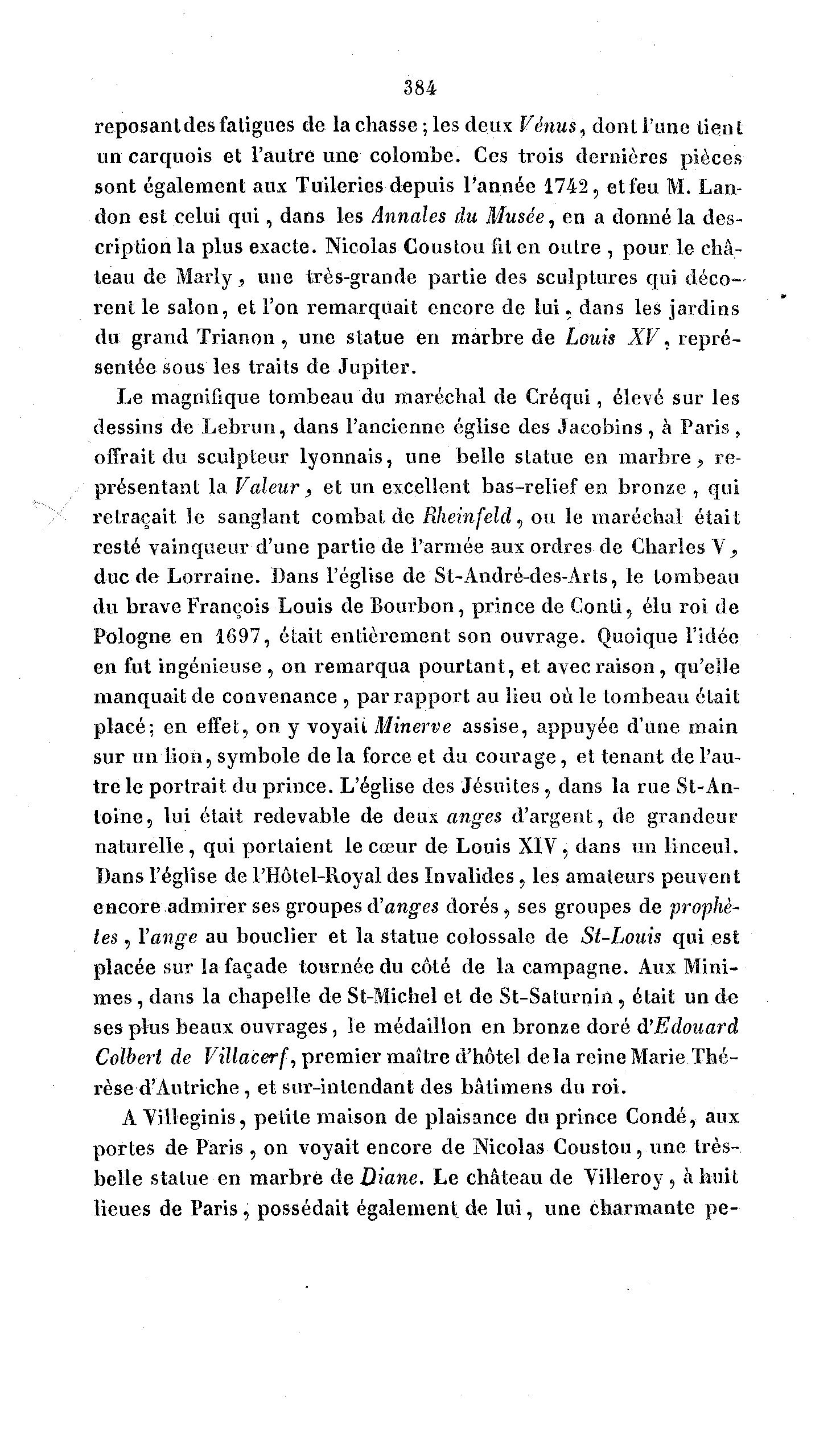 384 reposanldes fatigues de la chasse ; les deux Vénus, dont l'une tient un carquois et l'autre une colombe. Ces trois dernières pièces sont également aux Tuileries depuis l'année 1742, et feu M. Lan- don est celui q u i , dans les annales du Musée, en a donné la des- cription la plus exacte. Nicolas Coustou fit en outre , pour le châ- teau de Marly, une très-grande partie des sculptures qui déco- rent le salon, et l'on remarquait encore de l u i . dans les jardins du grand T r i a n o n , une statue en marbre de Louis XV, repré- sentée sous les traits de Jupiter. Le magnifique tombeau du maréchal de Créqui, élevé sur les dessins de L e b r u n , dans l'ancienne église des Jacobins , à Paris , offrait du sculpteur lyonnais, une belle statue en m a r b r e , re- présentant la Valeur , et un excellent bas-relief en bronze , qui retraçait le sanglant combat de Rheinfeld, ou le maréchal était resté vainqueur d'une partie de l'armée aux ordres de Charles Y , duc de Lorraine. Dans l'église de St-André-des-Àrts, le tombeau du brave François Louis de Bourbon, prince de Conti, élu roi de Pologne en 1697, était entièrement son ouvrage. Quoique l'idée en fut ingénieuse, on remarqua pourtant, et avec raison, qu'elle manquait de convenance , par rapport au lieu où le tombeau était placé; en effet, on y voyait Minerve assise, appuyée d'une main sur un lion, symbole de la force et du c o u r a g e , et tenant de l'au- tre le portrait du prince. L'église des Jésuites, dans la rue St-Àn- loine, lui était redevable de deux anges d'argent, de grandeur naturelle, qui portaient le cœur de Louis XIV, dans un linceul. Dans l'église de l'Hôtel-Royal des Invalides, les amateurs peuvent encore admirer ses groupes d'anges d o r é s , ses groupes de prophè- tes , l'ange au bouclier et la statue colossale de St-Louis qui est placée sur la façade tournée du côté de la campagne. Aux Mini- mes , dans la chapelle de St-Michel et de St-Saturnin, était un de ses plus beaux ouvrages, le médaillon en bronze doré d'Edouard Colbert de Villacerf, premier maître d'hôtel delà reine Marie Thé- rèse d'Autriche , et sur-intendant des bâlimens du roi. A Yilleginis, petite maison de plaisance du prince Condé, aux portes de Paris , on voyait encore de Nicolas Coustou, une très- belle statue en marbré de Diane. Le château de Villeroy , à huit lieues de Paris, possédait également de l u i , une charmante p e -