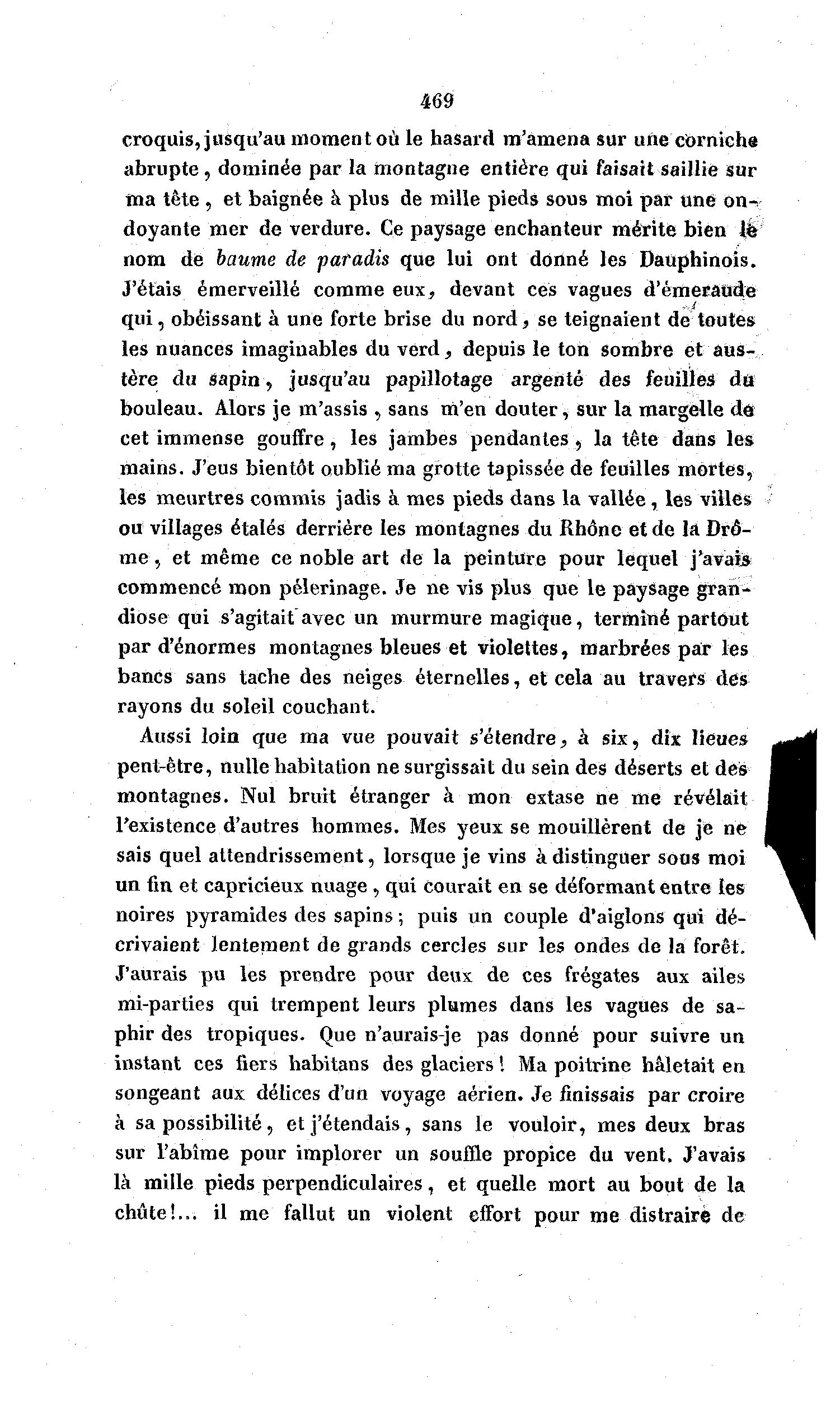 469 croquis, jusqu'au moment où le hasard m'amena sur une corniche abrupte, dominée par la montagne entière qui faisait saillie sur ma tête , et baignée à plus de mille pieds sous moi par une on- doyante mer de verdure. Ce paysage enchanteur mérite bien W nom de baume de paradis que lui ont donné les Dauphinois. J'étais émerveillé comme eux, devant ces vagues d'émeraude qui, obéissant à une forte brise du nord, se teignaient de toutes les nuances imaginables du verd, depuis le ton sombre et aus- tère du Sapin, jusqu'au papillotage argenté des feuilles dû bouleau. Alors je m'assis , sans m'en douter, sur la margelle de cet immense gouffre, les jambes pendantes , la tête dans les mains. J'eus bientôt oublié ma grotte tapissée de feuilles mortes, les meurtres commis jadis à mes pieds dans la vallée, les villes ou villages étalés derrière les montagnes du Rhône et de la Drô- m e , et même ce noble art de la peinture pour lequel j'avais commencé mon pèlerinage. Je ne vis plus que le paysage gran- diose qui s'agitait avec un murmure magique, terminé partout par d'énormes montagnes bleues et violettes, marbrées par les bancs sans tache des neiges éternelles, et cela au travers des rayons du soleil couchant. Aussi loin que ma vue pouvait s'étendre, à six, dix lieues pent-être, nulle habitation ne surgissait du sein des déserts et des montagnes. Nul bruit étranger à mon extase ne me révélait l'existence d'autres hommes. Mes yeux se mouillèrent de je ne sais quel attendrissement, lorsque je vins à distinguer sous moi un fin et capricieux nuage , qui courait en se déformant entre les noires pyramides des sapins ; puis un couple d'aiglons qui dé- crivaient lentement de grands cercles sur les ondes de la forêt. J'aurais pu les prendre pour deux de ces frégates aux ailes mi-parties qui trempent leurs plumes dans les vagues de sa- phir des tropiques. Que n'aurais-je pas donné pour suivre un instant ces fiers habitans des glaciers ! Ma poitrine haletait en songeant aux délices d'un voyage aérien. Je finissais par croire à sa possibilité, et j'étendais, sans le vouloir, mes deux bras sur l'abîme pour implorer un souffle propice du vent. J'avais là mille pieds perpendiculaires, et quelle mort au bout de la chute!... il me fallut un violent effort pour me distraire de
