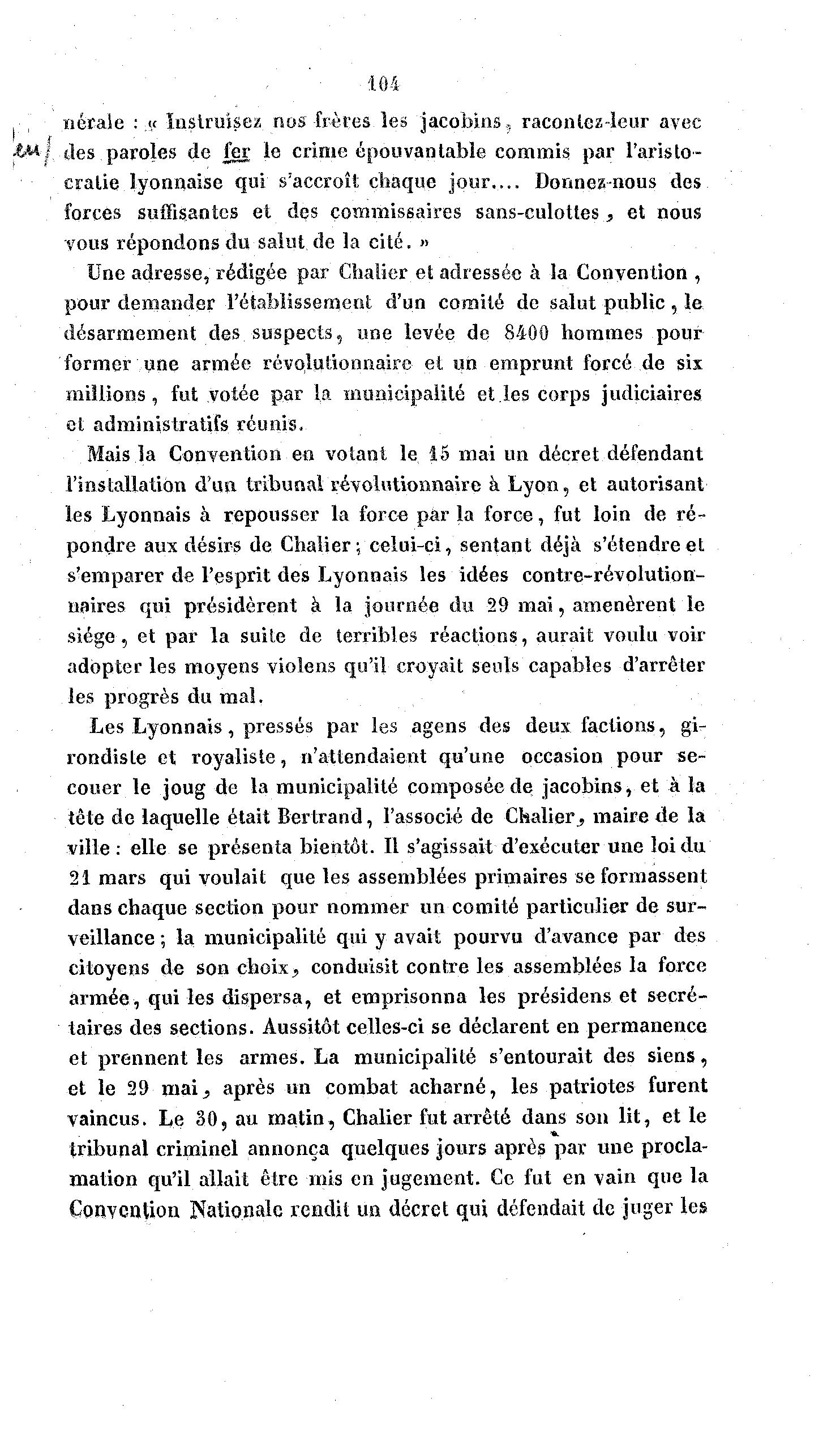 vaincus. Le 30, au matin, Chalier fut arrêté dans son lit, et le