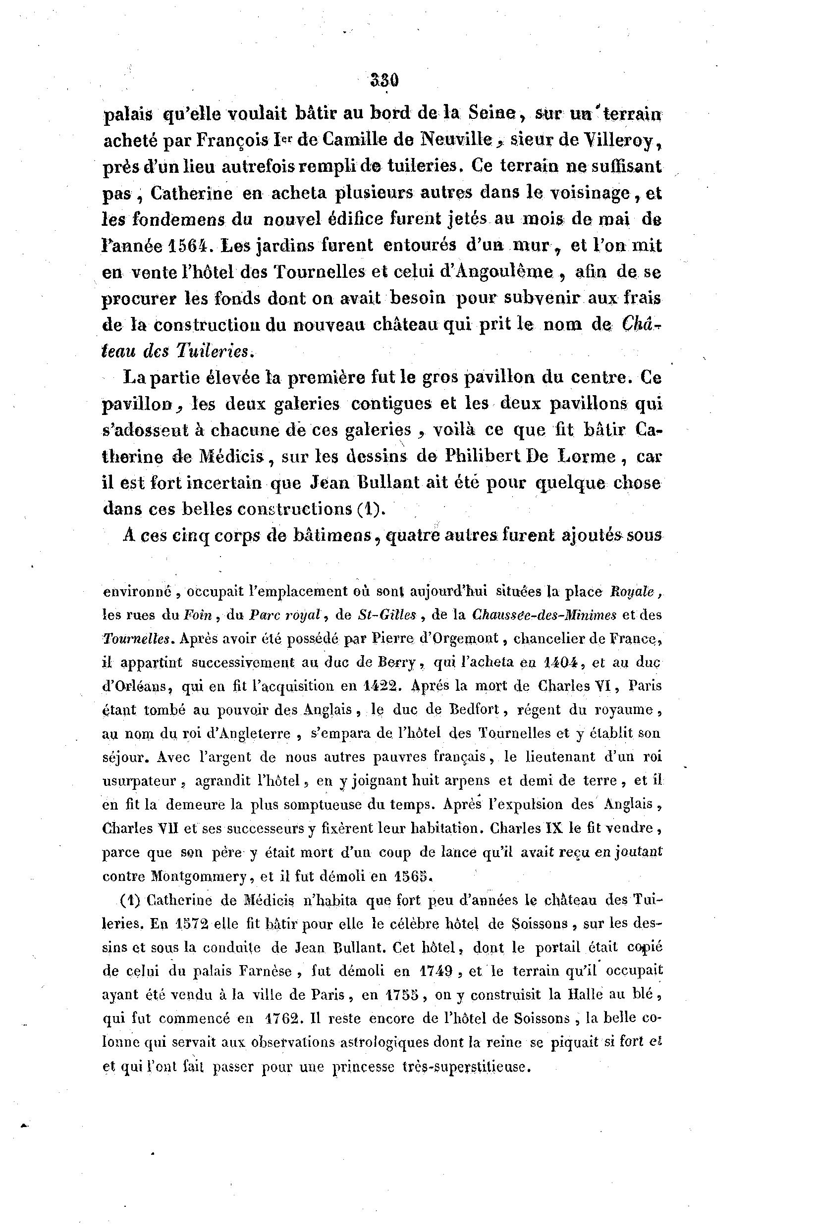 330 palais qu'elle voulait bâtir au bord de la Seine, sur ua'terrain acheté par François I« de Camille de Neuville , sieur de Yilleroy, près d'un lieu autrefois rempli de tuileries. Ce terrain ne suffisant pas , Catherine en acheta plusieurs autres dans le voisinage , et les fbndemens du nouvel édifice furent jetés au mois de mai de Paanée 1564. Les jardins furent entourés d'un m u r , et l'on mit en vente l'hôtel des Tournelles et celui d'Angoulème , afin de se procurer les fonds dont on avait besoin pour subvenir aux frais de la Construction du nouveau château qui prit le nom de Çhâ-r teau des Tuileries. La partie élevée la première fut le gros pavillon du centre. Ce pavillon^ les deux galeries contigues et les deux pavillons qui s'adossent à chacune dé ces galeries , voilà ce que fit bâtir Ga* therine de Médicis, sur les dessins de Philibert De Lorme , car il est fort incertain que Jean Bullant ait été pour quelque chose dans ces belles constructions (1). À ces cinq corps de bâtimens, quatre autres furent ajoutés sous environné , occupait l'emplacement où sont aujourd'hui situées la place Royale, les rues du Foin , au Parc royal, de St-Gilles , de la Chattssee-des-Minimes et des Tournelles. Après avoir été possédé par Pierre d'Orgemont, chancelier de France, il appartint successivement au duc de Be-rry, qui l'acheta en 1404, et au duc d'Orléans, qui en fit l'acquisition en 1422. Après la mort de Charles VI, Paris étant tombé au pouvoir des Anglais , le duc de Bedfort, régent du royaume, au nom du roi d'Angleterre , s'empara de, l'hôtel des Tournelles et y établit son séjour. Avec l'argent de nous autres pauvres français, le lieutenant d'un roi usurpateur , agrandit l'hôtel, eu j joignant huit arpens et demi de terre , et il en fit la demeure la plus somptueuse du temps. Après l'expulsion des Anglais , Charles VII et ses successeurs y fixèrent leur habitation. Charles IX le fit vendre , parce que son père y était mort d'un coup de lance qu'il avait reçu en joutant contre Montgommery, et il fut démoli en 156S. (1) Catherine de Médicis, n'habita que fort peu d'années le château des Tui- leries. En 1572 elle fit bâtir pour elle le célèbre hôtel de Soissons , sur les des- sins et sous la conduite de Jean Bullant. Cet hôtel, dont le portail était copié de celui du palais Farnèse , fut démoli en 1749 , et le terrain qu'il occupait ayant été vendu à la ville de Paris , en 1755 , on y construisit la Halle au blé , qui fut commencé en 1762. Il reste encore de l'hôtel de Soissons , la belle co- lonne qui servait aux observations astrologiques dont la reine se piquait si fort et et qui l'ont fait passer pour une princesse très-superstitieuse.
