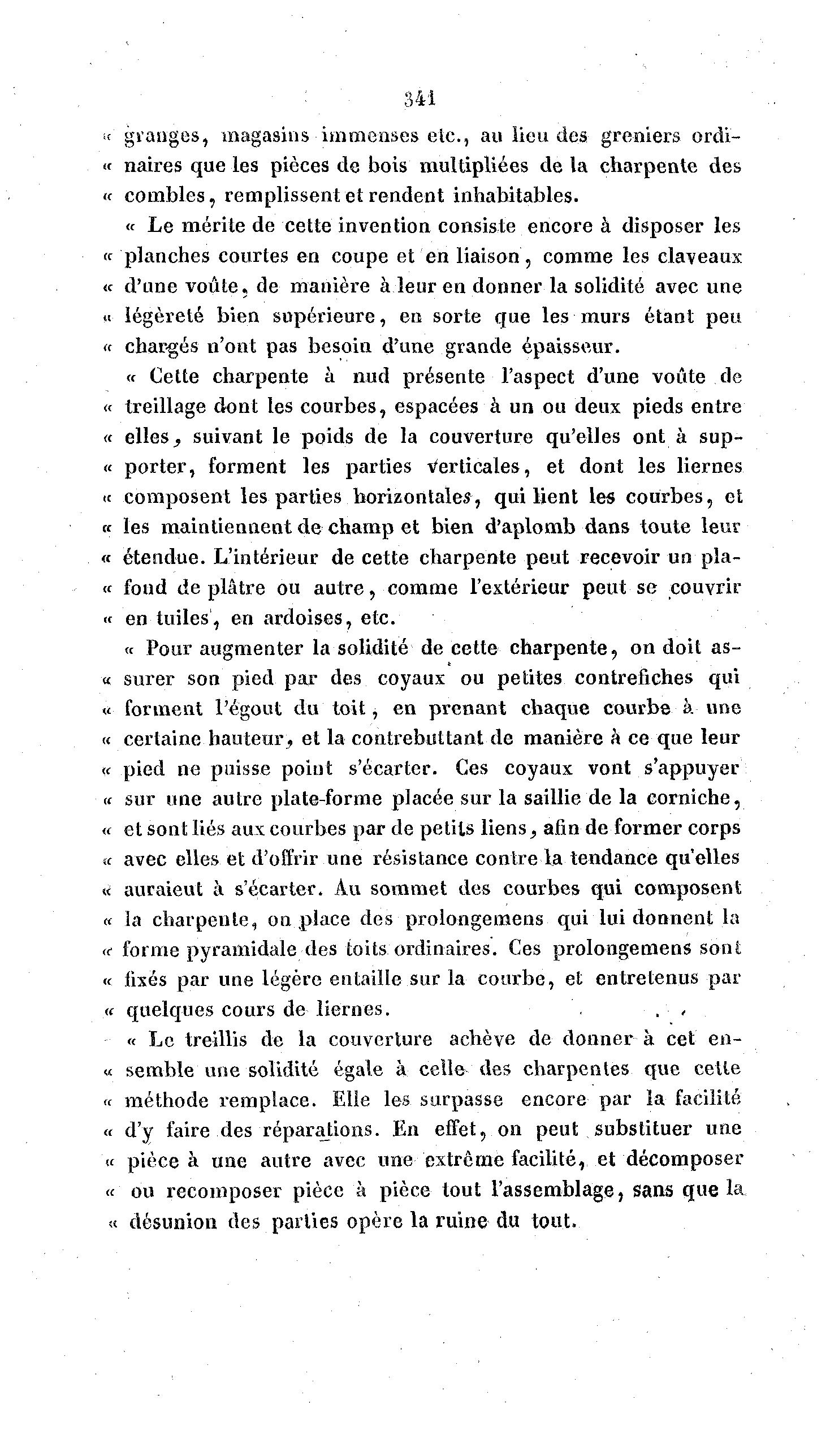 341 « granges, magasins immenses etc., au lieu des greniers ordï- « naires que les pièces de bois multipliées de la charpente des « combles, remplissent et rendent inhabitables. « Le mérite de cette invention consiste encore à disposer les « planches courtes en coupe et en liaison, comme les claveaux « d'une voûte, de manière à leur en donner la solidité avec une « légèreté bien supérieure, en sorte que les murs étant peu « chargés n'ont pas besoin d'une grande épaisseur. « Cette charpente à nud présente l'aspect d'une voûte de « treillage dont les courbes, espacées à un ou deux pieds entre « elles, suivant le poids de la couverture qu'elles ont à sup- « porter, forment les parties Verticales, et dont les liernes « composent les parties horizontales, qui lient les courbes, et « les maintiennent de champ et bien d'aplomb dans toute leur « étendue. L'intérieur de cette charpente peut recevoir un pla- ît fond de plâtre ou autre, comme l'extérieur peut se couvrir « en tuiles, en ardoises, etc. « Pour augmenter la solidité de cette charpente, on doit as- « surer son pied par des coyaux ou petites contrefiches qui « forment l'é'gout du toit, en prenant chaque courbe à une « certaine hauteur., et la contrebuttant de manière à ce que leur « pied ne puisse point s'écarter. Ces coyaux vont s'appuyer « sur une autre plate-forme placée sur la saillie de la corniche, « et sont liés aux courbes par de petits liens, afin de former corps « avec elles et d'offrir une résistance contre la tendance qu'elles « auraieut à s'écarter. Au sommet des courbes qui composent « la charpente, on place des prolongemens qui lui donnent la < forme pyramidale des toits ordinaires. Ces prolongemens sont f « lises par une légère entaille sur la courbe, et entretenus par « quelques cours de liernes. « Le treillis de la couverture achève de donner à cet en- « semble une solidité égale à celle des charpentes que cette « méthode remplace. Elle les surpasse encore par la facilité « d'y faire des réparations. En effet, on peut substituer une « pièce à une autre avec une extrême facilité, et décomposer « ou recomposer pièce à pièce tout l'assemblage, sans que la « désunion des parties opère la ruine du tout.