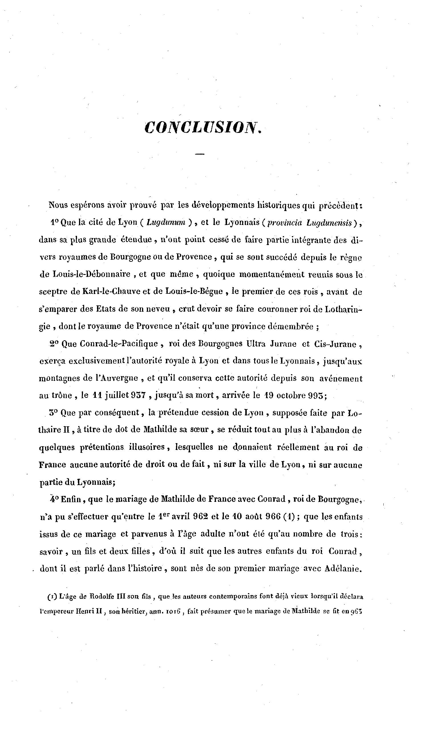 CONCLUSION. Nous espérons avoir prouvé par les développements historiques qui précèdent: 1° Que la cité de Lyon ( Lugdtmum ) , et le Lyonnais ( provincia Liujdunetkis ) , dans sa plus grande étendue, n'ont point cessé de faire partie intégrante des di- vers royaumes de Bourgogne ou de Provence, qui se sont succédé depuis le règne de Louis-Ie-Débonnaire , et que même , quoique momentanément réunis sous le sceptre de Karl-le-Cliauve et de Louis-le-Bégue , le premier de ces rois , avant de s'emparer des Etats de son neveu , crut devoir se faire couronner roi de Lotharin- gie , dont le royaume de Provence n'était qu'une province démembrée ; 2° Que Conrad-le-Pacifique , roi des Bourgognes Ultra Jurane et Cis-Jurane , exerça exclusivement l'autorité royale à Lyon et dans tous le Lyonnais, jusqu'aux montagnes de l'Auvergne , et qu'il conserva cette autorité depuis son avènement au trône , le 11 juillet 937 , jusqu'à sa mort, arrivée le 19 octobre 995; 5° Que par conséquent, la prétendue cession de Lyon , supposée faite par Lo- thaire I I , à titre de dot de Mathilde sa sœur , se réduit tout au plus à l'abandon de quelques prétentions illusoires, lesquelles ne donnaient réellement au roi de France aucune autorité de droit ou de fait, ni sur la ville de Lyon, ni sur aucune partie du Lyonnais; 4° Enfin, que le mariage de Mathilde de France avec Conrad, roi de Bourgogne, n'a pu s'effectuer qu'entre le 1 e r avril 962 et le 10 août 966 (1); que les enfants issus de ce mariage et parvenus à l'âge adulte n'ont été qu'au nombre de trois : savoir , un fils et deux filles, d'où il suit que les autres enfants du roi Conrad , dont il est parlé dans l'histoire , sont nés de son premier mariage avec Adélanie. ( 0 L'âge de Rodolfe III son fils , que les auteurs contemporains font déjà vieux lorsqu'il déclara l'empereur Henri I I , son héritier, ann. 1016 , fait présumer que le mariage de Mathilde se fit en 965