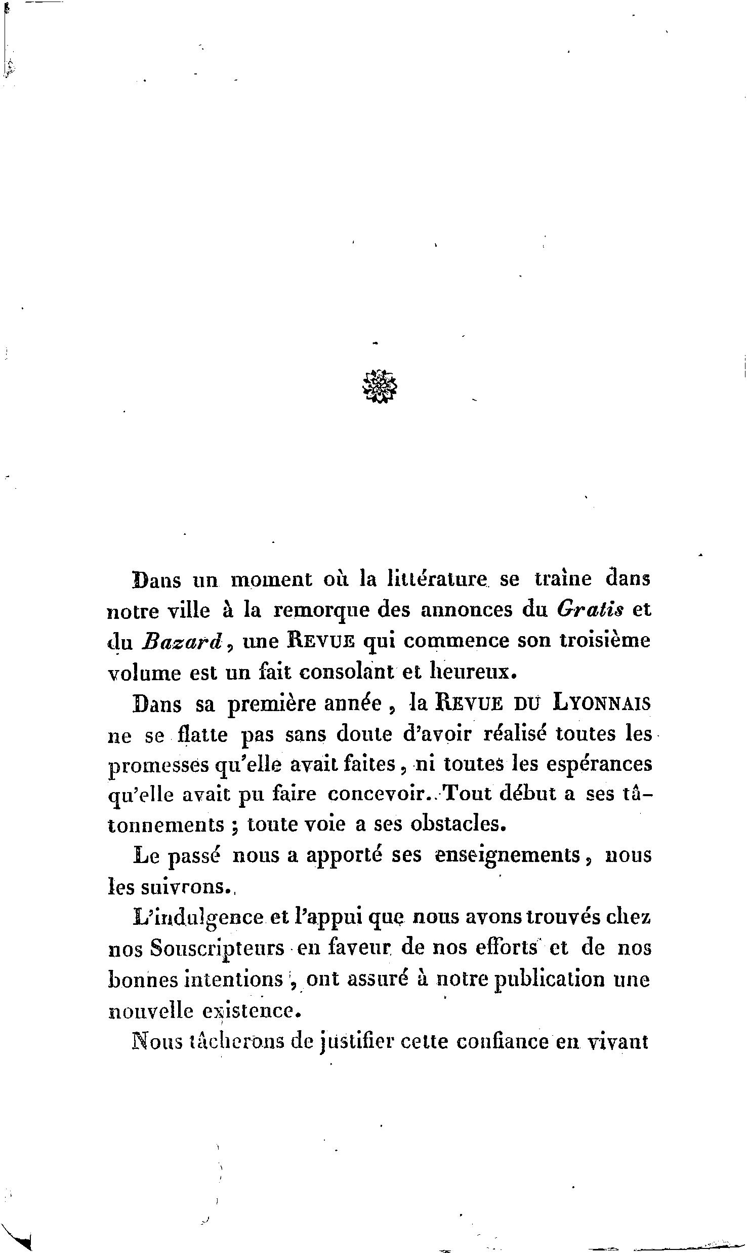 i$ Dans un moment où la littérature se traîne dans notre ville à la remorque des annonces du Gratis et du Bazard, une REVUE qui commence son troisième volume est un fait consolant et heureux. Dans sa première année , la REVUE DÛ LYONNAIS ne se flatte pas sans doute d'avoir réalisé toutes les promesses qu'elle avait faites, ni toutes les espérances qu'elle avait pu faire concevoir..Tout début a ses tâ- tonnements ; toute voie a ses obstacles. Le passé nous a apporté ses enseignements, nous les suivrons., L'indulgence, et l'appui quç nous avons trouvés chez nos Souscripteurs en faveur de nos efforts et de nos bonnes intentions ; , ont assuré à notre publication une nouvelle existence. Nous tâcherons de justifier celte confiance en vivant