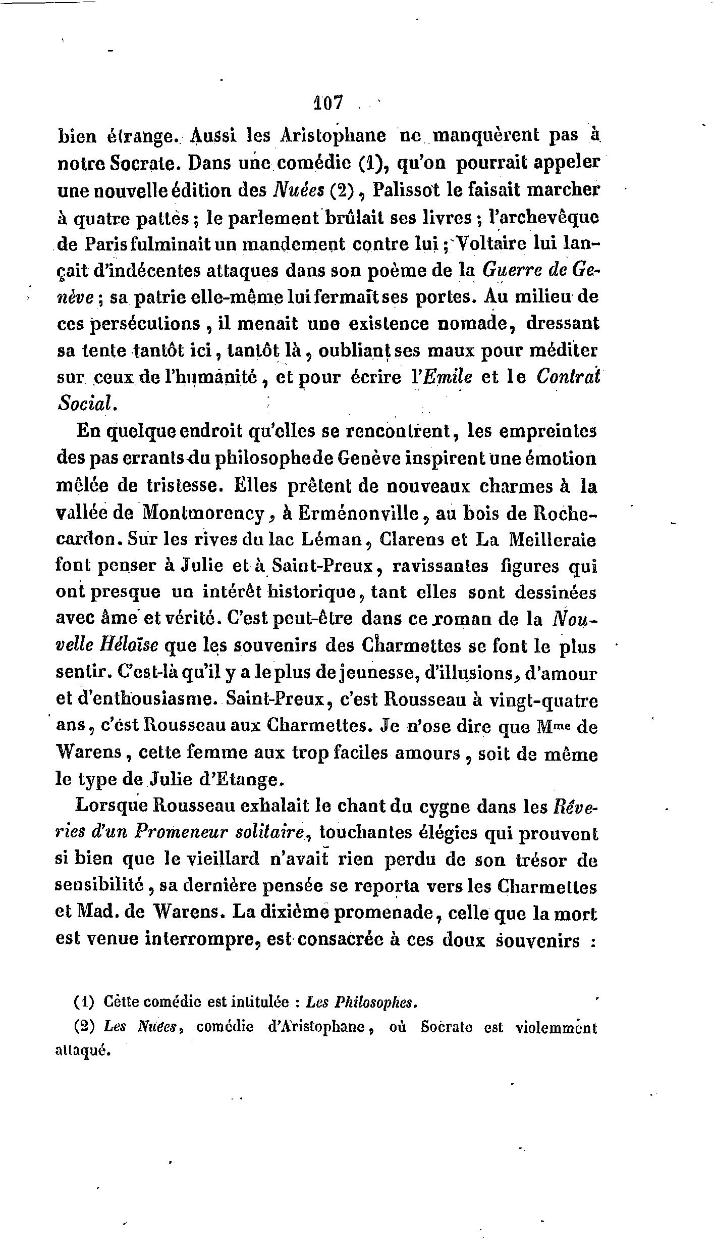 107 . bien étrange. Aussi les Aristophane ne manquèrent pas à notre Socrale. Dans une comédie (1), qu'on pourrait appeler une nouvelle édition des Nuées (2), Palissot le faisait marcher à quatre pattes ; le parlement brûlait ses livres ; l'archevêque de Paris fulminait un mandement contre lui ;~Voltaire lui lan- çait d'indécentes attaques dans son poème de la Guerre de Ge- nève ; sa patrie elle-même lui fermait ses portes. Au milieu de ces persécutions , il menait une existence nomade, dressant sa lente tantôt ici, tantôt l à , oubliant ses maux pour méditer sur ceuxderhumà nité, et pour écrire l'Emile et le Contrat Social. En quelque endroit qu'elles se rencontrent, les empreintes des pas errants du philosophede Genève inspirent une émotion mêlée de tristesse. Elles prêtent de nouveaux charmes à la vallée de Montmorency, à Ermenonville, au bois de Roche- cardon. Sur les rives du lac Léman, Clarens et La Meilleraie font penser à Julie et à Saint-Preux, ravissantes figures qui ont presque un intérêt historique, tant elles sont dessinées avec âme et vérité. C'est peut-être dans ce .roman de la Nou- velle Hélaïse que les souvenirs des Charmeltes se font le plus sentir. Ces t-là qu'il y a le plus de jeunesse, d'illusions, d'amour et d'enthousiasme. Saint-Preux, c'est Rousseau à vingt-quatre ans, c'est Rousseau aux Charmeltes. Je n'ose dire que Mme de Warens, cette femme aux trop faciles amours , soit de même le type de Julie d'Etange. Lorsque Rousseau exhalait le chant du cygne dans les Rêve- ries d'un Promeneur solitaire, louchantes élégies qui prouvent si bien que le vieillard n'avait rien perdu de son trésor de sensibilité, sa dernière pensée se reporta vers les Charmeltes et Mad. de Warens. La dixième promenade, celle que la mort est venue interrompre, est consacrée à ces doux souvenirs : (1) Cette comédie est intitulée : Les Philosophes. (2) Les Nuées, comédie d'Aristophane, où Socrate est violemment allaqué.
