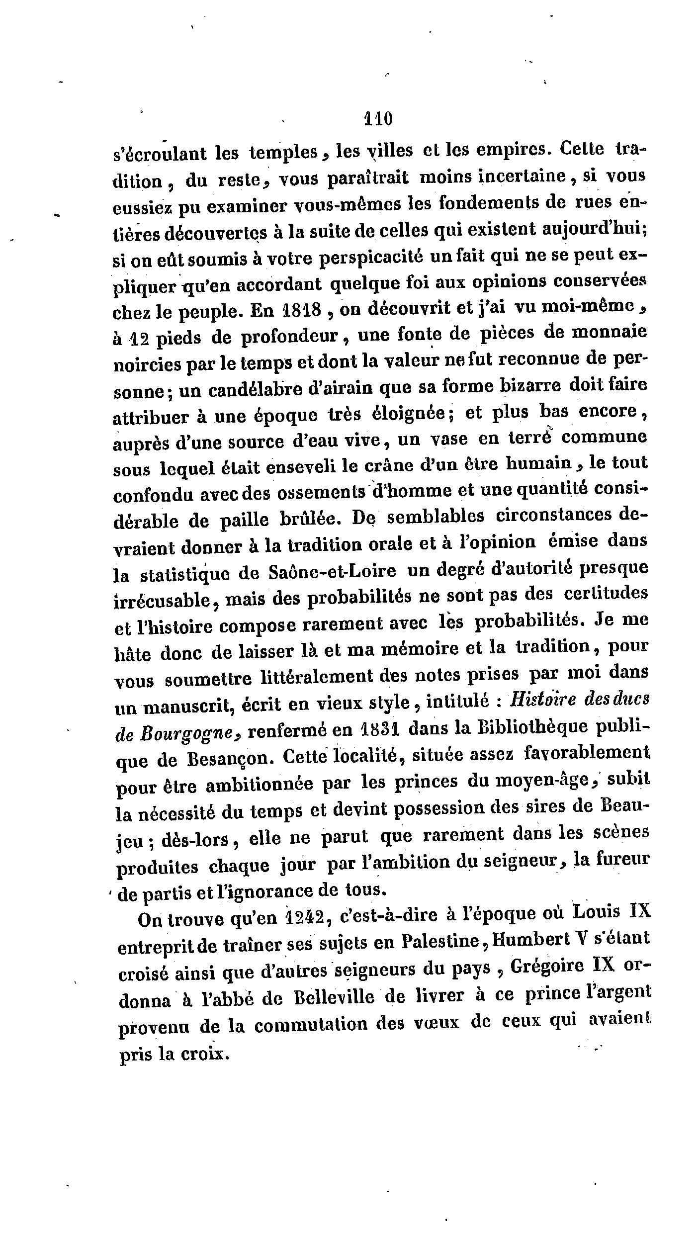 110 s'ècroulant les temples } les villes et les empires. Cette tra- dition , du reste, vous paraîtrait moins incertaine, si vous eussiez pu examiner vous-mêmes les fondements de rues en- tières découvertes â la suite de celles qui existent aujourd'hui; si on eût soumis à votre perspicacité un fait qui ne se peut ex- pliquer qu'en accordant quelque foi aux opinions conservées chez le peuple. En 1818 , on découvrit et j'ai vu moi-même , à 12 pieds de profondeur, une fonte de pièces de monnaie noircies par le temps et dont la valeur ne fut reconnue de per- sonne ; un candélabre d'airain que sa forme bizarre doit faire attribuer à une époque très éloignée ; et plus bas encore, auprès d'une source d'eau vive, un vase en terré commune sous lequel était enseveli le crâne d'un être humain , le tout confondu avec des ossements d'homme et une quantité consi- dérable de paille brûlée. De semblables circonstances de- vraient donner à la tradition orale et à l'opinion émise dans la statistique de Saône-et-Loire un degré d'autorité presque irrécusable, mais des probabilités ne sont pas des certitudes et l'histoire compose rarement avec lès probabilités. Je me hâte donc de laisser là . et ma mémoire et la tradition, pour vous soumettre littéralement des notes prises par moi dans un manuscrit, écrit en vieux style, intitulé : Histoire des ducs de Bourgogne^ renfermé en 1831 dans la Bibliothèque publi- que de Besançon. Cette localité, située assez favorablement pour être ambitionnée par les princes du moyen-âge," subit la nécessité du temps et devint possession des sires de Beau- jeu ; dès-lors, elle ne parut que rarement dans les scènes produites chaque jour par l'ambition du seigneur, la fureur de partis et l'ignorance de tous. On trouve qu'en 1242, c'est-à -dire à l'époque où Louis IX entreprit de traîner ses sujets en Palestine, Humbert Y s'étant croisé ainsi que d'autres seigneurs du pays , Grégoire IX or- donna à l'abbé de Belleville de livrer à ce prince l'argent provenu de la commutation des vœux de ceux qui avaient pris la croix.