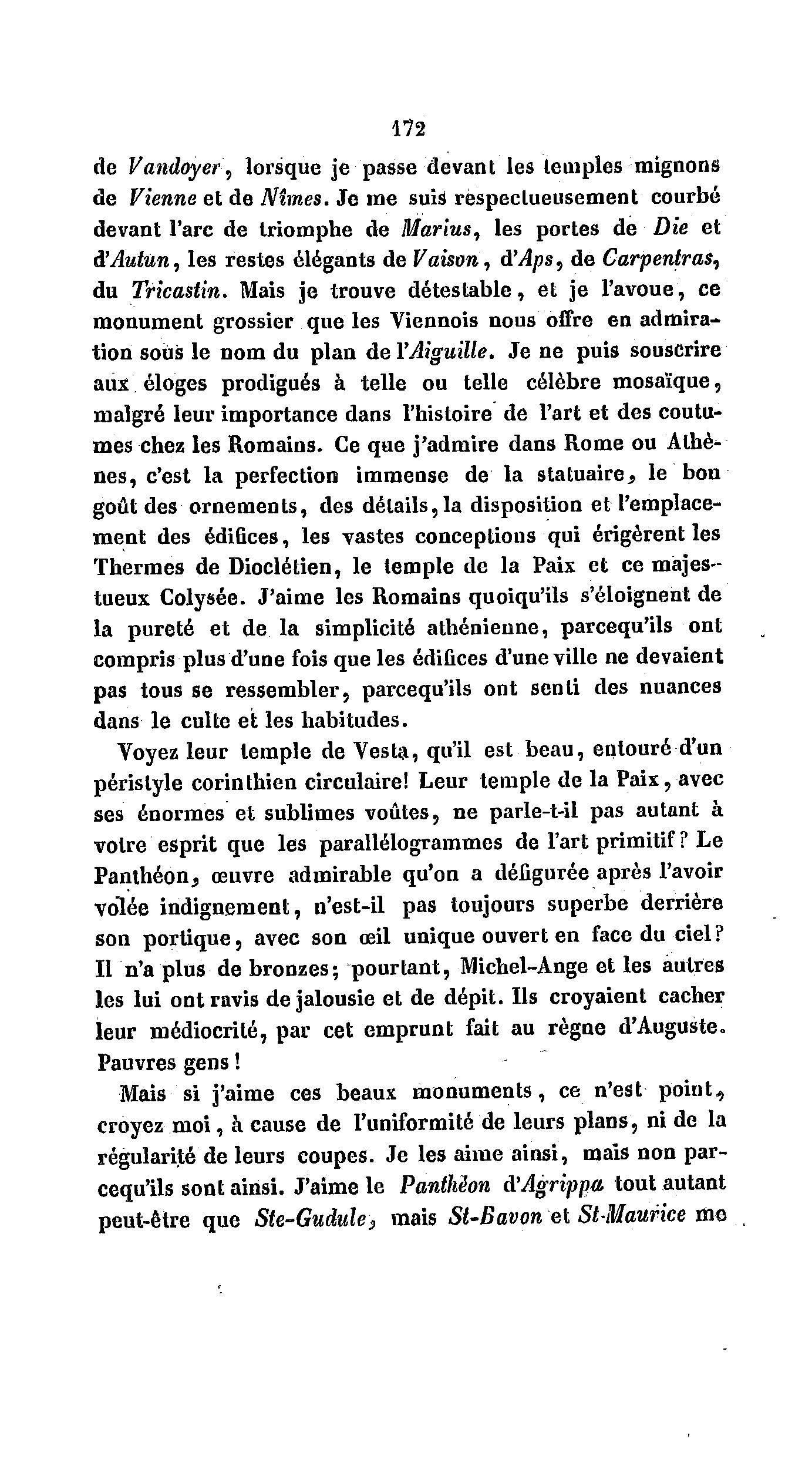 172 de Vandoyer, lorsque je passe devant les temples mignons de Vienne et de Nîmes. Je me suis respectueusement courbé devant l'arc de triomphe de Marins, les portes de Die et d'Autun, les restes élégants de Vaison, d'Aps, de Carpentras, du Tricastin. Mais je trouve détestable, et je l'avoue, ce monument grossier que les Viennois nous offre en admira- tion sous le nom du plan de YAiguille. Je ne puis souscrire aux éloges prodigués à telle ou telle célèbre mosaïque, malgré leur importance dans l'histoire de l'art et des coutu- mes chez les Romains. Ce que j'admire dans Rome ou Alhè^ nés, c'est la perfection immense de la statuaire ; le bon goût des ornements, des détails,la disposition et l'emplace- ment des édifices, les vastes conceptions qui érigèrent les Thermes de Dioctétien, le temple de la Paix et ce majes- tueux Colysée. J'aime les Romains quoiqu'ils s'éloignent de la pureté et de la simplicité athénienne, parcequ'ils ont compris plus d'une fois que les édifices d'une ville ne devaient pas tous se ressembler, parcequ'ils ont senti des nuances dans le culte et les habitudes. Voyez leur temple de Vesta, qu'il est beau, entouré d'un péristyle corinthien circulaire! Leur temple de la Paix, avec ses énormes et sublimes voûtes, ne parle-t-il pas autant à votre esprit que les parallélogrammes de l'art primitif ? Le Panthéonj œuvre admirable qu'on a défigurée après l'avoir volée indignement, n'est-il pas toujours superbe derrière son portique, avec son œil unique ouvert en face du ciel ? Il n'a plus de bronzes; pourtant, Michel-Ange et les autres les lui ont ravis de jalousie et de dépit. Ils croyaient cacher leur médiocrité, par cet emprunt fait au règne d'Auguste. Pauvres gens ! Mais si j'aime ces beaux monuments, ce n'est poiut^ croyez moi, à cause de l'uniformité de leurs plans, ni de la régularité de leurs coupes. Je les aime ainsi, mais non par- cequ'ils sont ainsi. J'aime le Panthéon à !Agrippa tout autant peut-être que Ste-Gudule, mais St-Bavon et St-Maurice me