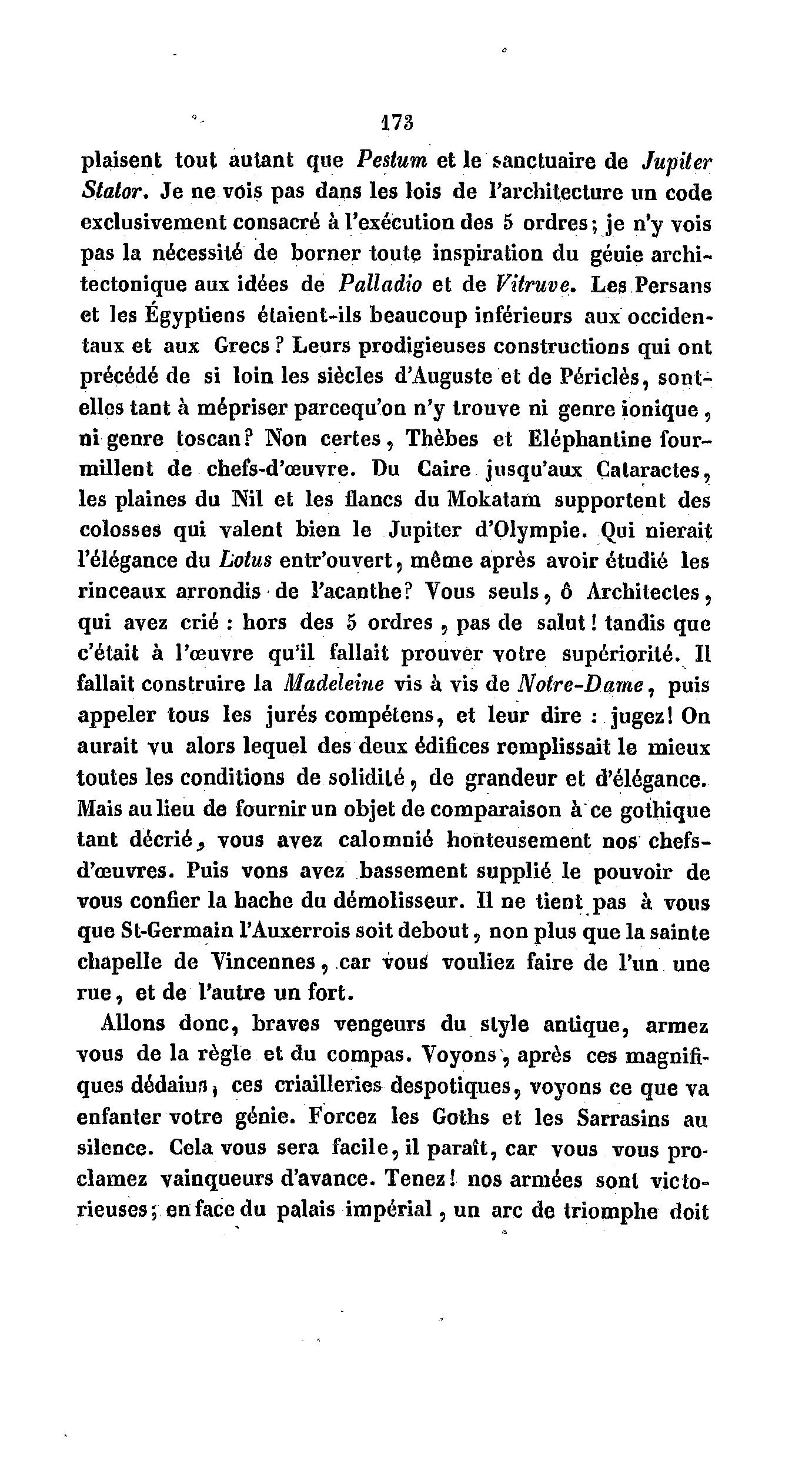 173 plaisent tout autant que Pestum et le sanctuaire de Jupiter Stator. Je ne vois pas dans les lois de l'architecture un code exclusivement consacré à l'exécution des 5 ordres ; je n'y vois pas la nécessité de borner toute inspiration du géuie archi- tectonique aux idées de Palladio et de Vitruve. Les Persans et les Egyptiens élaient-ils beaucoup inférieurs aux occiden- taux et aux Grecs ? Leurs prodigieuses constructions qui ont précédé de si loin les siècles d'Auguste et de Périclès, sont- elles tant à mépriser parcequ'on n'y trouve ni genre ionique, ni genre toscan ? Non certes, Thèbes et Eléphanline four- millent de chefs-d'œuvre. Du Caire jusqu'aux Cataractes, les plaines du Nil et les flancs du Mokatam supportent des colosses qui valent bien le Jupiter d'Olympie. Qui nierait l'élégance du Lotus entr'ouvert, même après avoir étudié les rinceaux arrondis de l'acanthe? Vous seuls, ô Architectes, qui avez crié : hors des 5 ordres , pas de salut ! tandis que c'était à l'œuvre qu'il fallait prouver votre supériorité. Il fallait construire la Madeleine vis à vis de Notre-Dame, puis appeler tous les jurés compétens, et leur dire : jugez! On aurait vu alors lequel des deux édifices remplissait le mieux toutes les conditions de solidité, de grandeur et d'élégance. Mais au lieu de fournir un objet de comparaison à ce gothique tant décrié^ vous avez calomnié honteusement nos chefs- d'œuvres. Puis vons avez bassement supplié le pouvoir de vous confier la hache du démolisseur. Il ne tient pas à vous que St-Germain l'Auxerrois soit debout, non plus que la sainte chapelle de Vincennes, car vousi vouliez faire de l'un une rue, et de l'autre un fort. Allons donc, braves vengeurs du style antique, armez vous de la règle et du compas. Voyons, après ces magnifi- ques dédaiun, ces criailleries despotiques, voyons ce que va enfanter votre génie. Forcez les Goths et les Sarrasins au silence. Cela vous sera facile, il paraît, car vous vous pro- clamez vainqueurs d'avance. Tenez ! nos armées sont victo- rieuses ; en face du palais impérial, un arc de triomphe doit