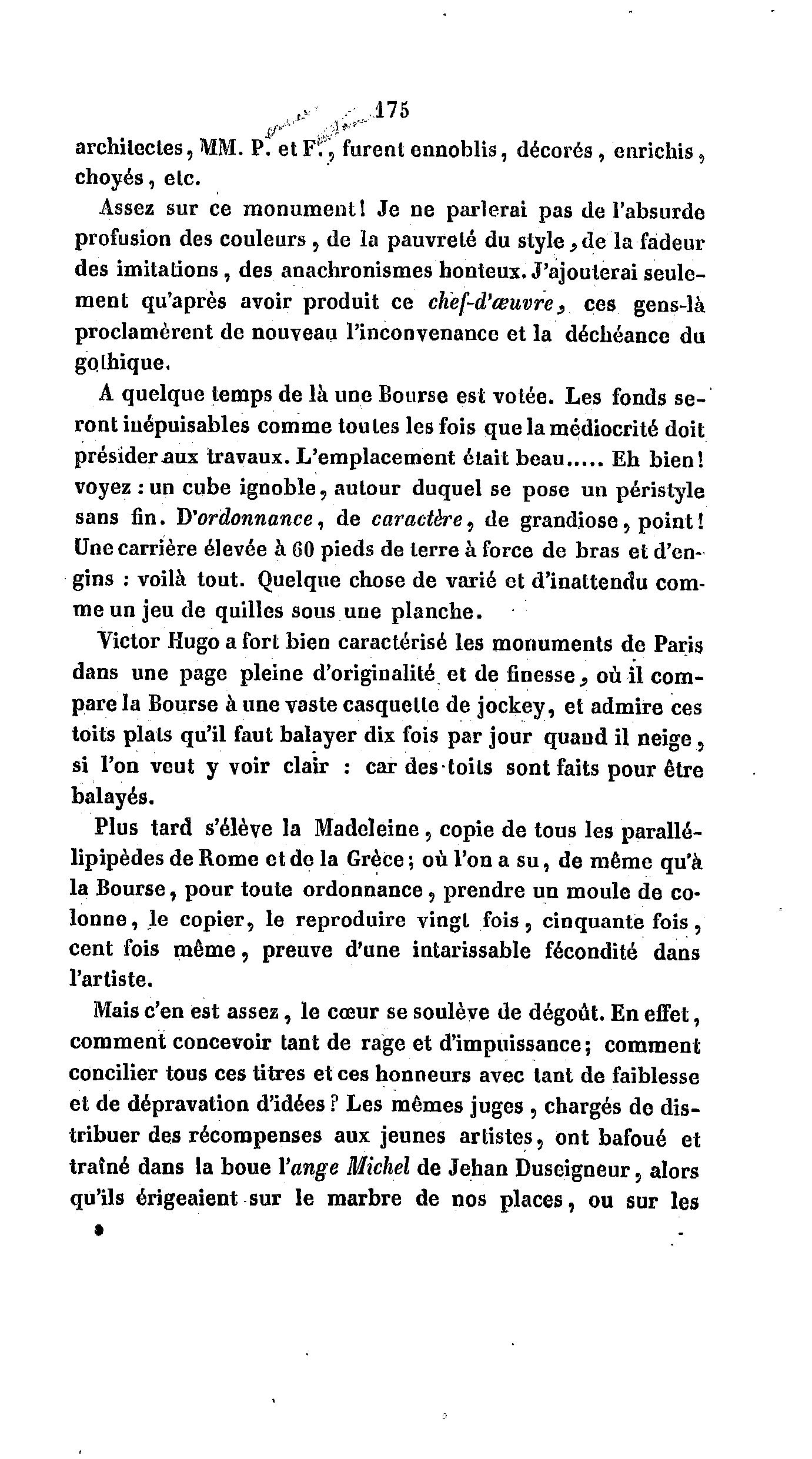 architectes, MM. P. et Ff, furent ennoblis, décorés, enrichis, choyés, etc. Assez sur ce monument! Je ne parlerai pas de l'absurde profusion des couleurs , de la pauvreté du style > de la fadeur des imitations, des anachronismes honteux. J'ajouterai seule- ment qu'après avoir produit ce chef-d'œuvre, ces gens-là proclamèrent de nouveau l'inconvenance et la déchéance du gothique. A quelque temps de là une Bourse est votée. Les fonds se- ront inépuisables comme toutes les fois que la médiocrité doit présider aux travaux. L'emplacement était beau Eh bien! voyez : un cube ignoble, autour duquel se pose un péristyle sans fin. D'ordonnance, de caractère, de grandiose, point ! Une carrière élevée à 60 pieds de terre à force de bras et d'en- gins : voilà tout. Quelque chose de varié et d'inattendu com- me un jeu de quilles sous une planche. Victor Hugo a fort bien caractérisé les monuments de Paris dans une page pleine d'originalité et de finesse , où il com- pare la Bourse à une vaste casquette de jockey, et admire ces toits plats qu'il faut balayer dix fois par jour quand il neige , si l'on veut y voir clair : car des toits sont faits pour être balayés. Plus tard s'élève la Madeleine, copie de tous les parallé- lipipèdes de Rome et de la Grèce ; où l'on a su, de même qu'à la Bourse, pour toute ordonnance, prendre un moule de co- lonne, le copier, le reproduire vingt fois, cinquante fois, cent fois même, preuve d'une intarissable fécondité dans l'artiste. Mais c'en est assez, le cœur se soulève de dégoût. En effet, comment concevoir tant de rage et d'impuissance ; comment concilier tous ces titres et ces honneurs avec tant de faiblesse et de dépravation d'idées ? Les mêmes juges , chargés de dis- tribuer des récompenses aux jeunes artistes, ont bafoué et traîné dans la boue l'ange Michel de Jehan Duseigneur, alors qu'ils érigeaient sur le marbre de nos places, ou sur les •