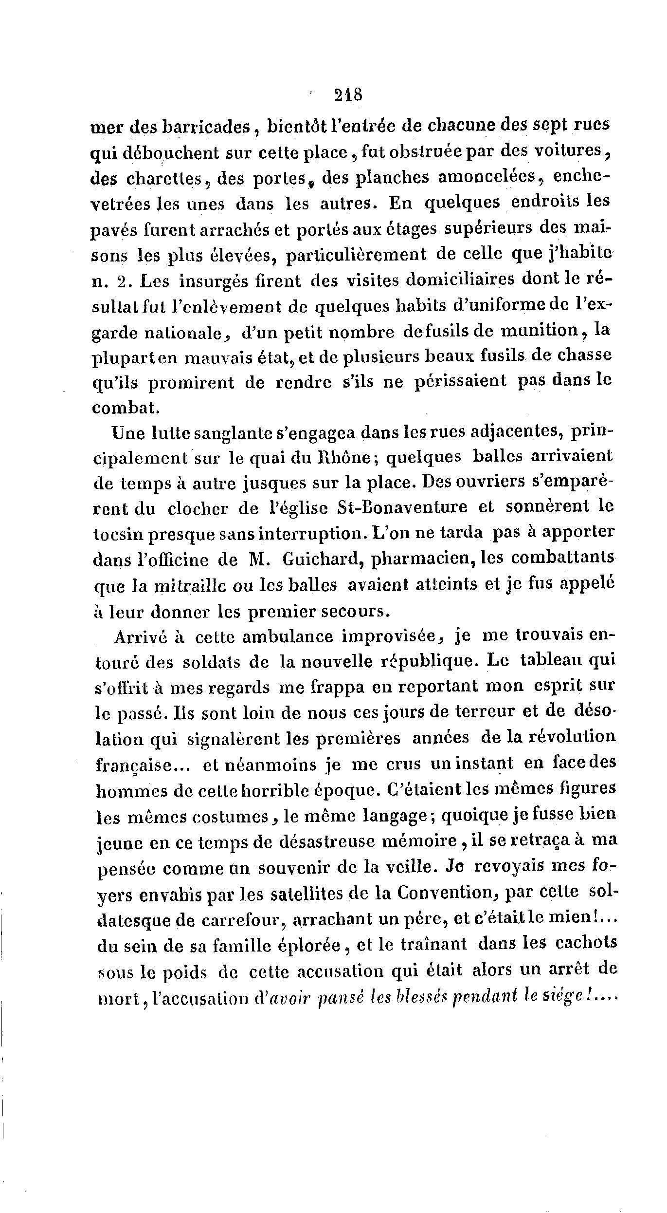 ' 218 mer des barricades, bientôt l'entrée de chacune des sept rues qui débouchent sur cette p l a c e , fut obstruée par des voitures, des charettes, des p o r t e s , des planches amoncelées, enche- vêtrées les unes dans les autres. En quelques endroits les pavés furent arrachés et portés aux étages supérieurs des mai- sons les plus élevées, particulièrement de celle que j'habite n. 2. Les insurgés firent des visites domiciliaires dont le r é - sultat fut l'enlèvement de quelques habits d'uniforme de l'ex- garde nationale^ d'un petit nombre defusilsde munition, la plupart en mauvais état, et de plusieurs beaux fusils de chasse qu'ils promirent de rendre s'ils ne périssaient pas dans le combat. Une lutte sanglante s'engagea dans les rues adjacentes, prin- cipalement sur le quai du Rhône; quelques balles arrivaient de temps à autre jusques sur la place. Des ouvriers s'emparè- rent du clocher de l'église St-Bonaventure et sonnèrent le tocsin presque sans interruption. L'on ne tarda pas à apporter dans l'officine de M. Guichard, pharmacien, les combattants que la mitraille ou les balles avaient atteints et je fus appelé à leur donner les premier secours. Arrivé à cette ambulance improvisée, je me trouvais en- touré des soldats de la nouvelle république. Le tableau qui s'offrit à mes regards me frappa en reportant mon esprit sur le passé. Ils sont loin de nous ces jours de terreur et de déso- lation qui signalèrent les premières années de la révolution française... et néanmoins je me crus un instant en facedes hommes de cette horrible époque. C'étaient les mêmes figures les mêmes costumes s le même langage; quoique je fusse bien jeune en ce temps de désastreuse mémoire , il se retraça à ma pensée comme un souvenir de la veille. J e revoyais mes fo- yers envahis par les satellites de la Convention, par celte sol- datesque de carrefour, arrachant un père, et c'étaitle mien!... du sein de sa famille éplorée, et le traînant dans les cachots sous le poids de cette accusation qui était alors un arrêt de mort,l'accusation A'avoir pansé les blessés pendant le siège!....