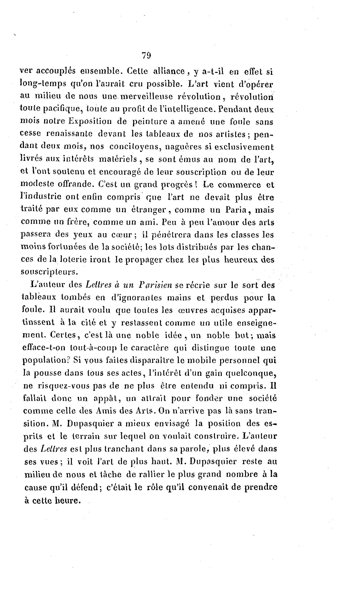 79 ver accouplés ensemble. Cette alliance, y a-t-il en effet si long-temps qu'on l'aurait cru possible. L'art vient d'opérer au milieu de nous une merveilleuse révolution, révolution toute pacifique, toute au profit de l'intelligence. Pendant deux mois notre Exposition de peinture a amené une foule sans cesse renaissante devant les tableaux de nos artistes ; p e n - dant deux mois, nos concitoyens, naguère» si exclusivement livrés aux intérêts matériels , se sont émus au nom de l'art, et l'ont soutenu et encouragé de leur souscription ou de leur modeste offrande. C'est un grand p r o g r è s ! Le commerce et l'industrie ont enfin compris que l'art ne devait plus être traité par eux comme un é t r a n g e r , comme un Paria, mais comme un frère, comme un ami. Peu à peu l'amour des arts passera des yeux au cœur ; il pénétrera dans les classes les moins fortunées de la société; les lots distribués par les chan- ces d e l à loterie iront le propager chez les plus heureux des souscripteurs. L'auteur des Lettres à un Parisien se récrie sur le sort des tableaux tombés en d'ignorantes mains et perdus pour la foule. Il aurait voulu que toutes les œuvres acquises appar- tinssent à la cité et y restassent comme un utile enseigne- ment. Certes, c'est là une noble i d é e , un noble b u t ; mais efface-t-on tout-à -coup le caractère qui dislingue toute une population? Si vous faites disparaître le mobile personnel qui la pousse dans tous ses actes, l'intérêt d'un gain quelconque, ne risquez-vous pas de ne plus être entendu ni compris. Il fallait donc un a p p â t , un attrait pour fonder une société comme celle des Amis des Arls. On n'arrive pas là sans tran- sition. M. Dupasquier a mieux envisagé la position des e s - prits et le terrain sur lequel on voulait construire. L'auteur des Lettres est plus tranchant dans sa parole, plus élevé dans ses vues; il voit l'art de plus haut. M. Dupasquier reste au milieu de nous et lâche de rallier le plus grand nombre à la cause qu'il défend; c'était le rôle qu'il convenait de prendre à cette heure.