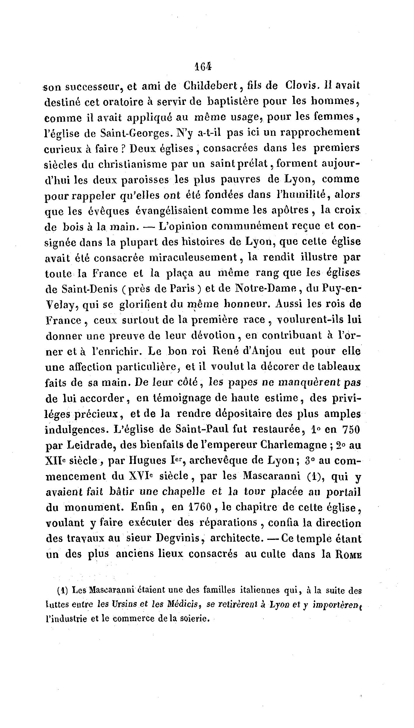 164 son successeur, et ami de Childeberl, fils de Clovis. 11 avait destiné cet oratoire à servir de baptistère pour les hommes, comme il avait appliqué au même usage, pour les femmes, l'église de Saint-Georges. N'y a-t-il pas ici un rapprochement curieux à faire ? Deux églises , consacrées dans les premiers siècles du christianisme par un saint prélat, forment aujour- d'hui les deux paroisses les plus pauvres de Lyon, comme pour rappeler qu'elles ont été fondées dans l'humilité, alors que les évêques évangélisaient comme les apôtres , la croix de bois à la main. — L'opinion communément reçue et con- signée dans la plupart des histoires de Lyon, que cette église avait été consacrée miraculeusement, la rendit illustre par toute la France et la plaça au même rang que les églises de Saint-Denis (près de Paris ) et de Notre-Dame, du Puy-en- Velay, qui se glorifient du même honneur. Aussi les rois de France , ceux surtout de la première race , voulurent-ils lui donner une preuve de leur dévotion, en contribuant à l'or- ner et à l'enrichir. Le bon roi René d'Anjou eut pour elle une affection particulière, et il voulut la décorer de tableaux faits de sa main. De leur côté, les papes ne manquèrent pas de lui accorder, en témoignage de haute estime, des privi- lèges précieux, et de la rendre dépositaire des plus amples indulgences. L'église de Saint-Paul fut restaurée, 1° en 750 par Leidrade, des bienfaits de l'empereur Charlemagne ; 2° au XIIe siècle, par Hugues I er , archevêque de Lyon; 3° au com- mencement du XYIC siècle, par les Mascaranni (1), qui y avaient fait bâtir une chapelle et la tour placée au portail du monument. Enfin , en 1760 , le chapitre de celte église, voulant y faire exécuter des réparations , confia la direction des travaux au sieur Degvinis, architecte. —Ce temple étant un des plus anciens lieux consacrés au culte dans la ROME (1) Les Mascaranni étaient une des familles italiennes qui, à la suite des luttes entre Jes Ursins et les Médicis, se retirèrent à Lyon et y importèrent l'industrie et le commerce de la soierie.