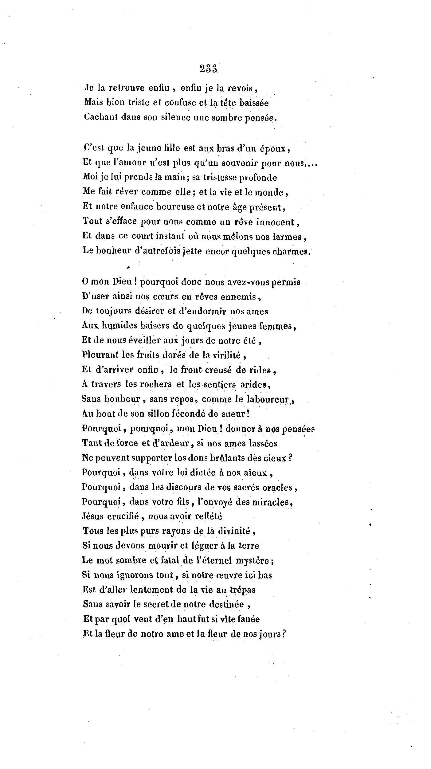233 Je la retrouve enfin , enfin je la revois, Mais bien triste et confuse et la tête baissée Cachant dans son silence une sombre pensée. C'est que la jeune fille est aux bras d'un époux, El que l'amour n'est plus qu'un souvenir pour nous,... Moi je lui prends la main ; sa tristesse profonde Me fait rêver comme elle ; et la vie et le monde, Et notre enfance heureuse et notre âge présent, Tout s'efface pour nous comme un rêve innocent, Et dans ce court instant où nous mêlons nos laïmes, Le bonheur d'autrefois jette encor quelques charmes. 0 mon Dieu ! pourquoi donc nous avez-vous permis D'user ainsi nos cœurs en rêves ennemis, De toujours désirer et d'endormir nos âmes Aux humides baisers de quelques jeunes femmes, Et de nous éveiller aux jours de notre été , Pleurant les fruits dorés de la virilité , Et d'arriver enfin , le front creusé de rides, A travers les rochers et les sentiers arides, Sans bonheur , sans repos, comme le laboureur , Au bout de son sillon fécondé de sueur! Pourquoi, pourquoi, mon Dieu ! donner à nos pensées Tant de force et d'ardeur, si nos âmes lassées Ne peuvent supporter les dons brûlants des deux ? Pourquoi, dans votre loi dictée à nos aïeux , Pourquoi, dans les discours de vos sacrés oracles , Pourquoi, dans votre fils, l'envoyé des miracles, Jésus crucifié , nous avoir reflété Tous les plus purs rayons de la divinité , Si nous devons mourir et léguer à la terre Le mot sombre et fatal de l'éternel mystère ; Si nous ignorons tout, si notre œuvre ici bas Est d'aller lentement de la vie au trépas Sans savoir le secret de notre destinée , Et par quel vent d'en haut fut si vite fanée Et la fleur de notre ame et la fleur de nos jours ?