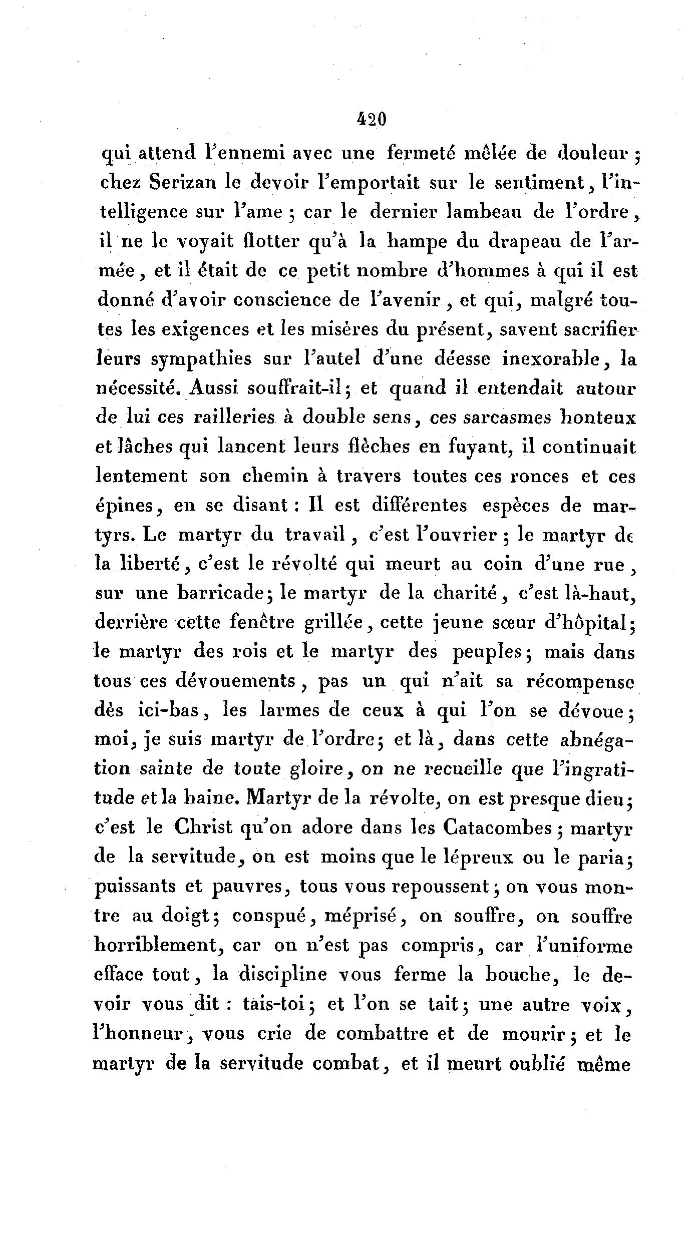 420 qui attend l'ennemi avec une fermeté mêlée de douleur ; chez Serizan le devoir l'emportait sur le sentiment, l'in- telligence sur l'ame ; car le dernier lambeau de l'ordre, il ne le voyait flotter qu'à la hampe du drapeau de l'ar- mée, et il était de ce petit nombre d'hommes à qui il est donné d'avoir conscience de l'avenir, et qui, malgré tou- tes les exigences et les misères du présent, savent sacrifier leurs sympathies sur l'autel d'une déesse inexorable, la nécessité. Aussi souffrait-il; et quand il entendait autour de lui ces railleries à double sens, ces sarcasmes honteux et lâches qui lancent leurs flèches en fuyant, il continuait lentement son chemin à travers toutes ces ronces et ces épines, en se disant : Il est différentes espèces de mar- tyrs. Le martyr du travail, c'est l'ouvrier ; le martyr de la liberté, c'est le révolté qui meurt au coin d'une rue , sur une barricade; le martyr de la charité, c'est là -haut, derrière cette fenêtre grillée, cette jeune sœur d'hôpital; le martyr des rois et le martyr des peuples; mais dans tous ces dévouements , pas un qui n'ait sa récompense dés ici-bas, les larmes de ceux à qui l'on se dévoue ; moi, je suis martyr de l'ordre; et là , dans cette abnéga- tion sainte de toute gloire, on ne recueille que l'ingrati- tude et la haine. Martyr de la révolte, on est presque dieu; c'est le Christ qu'on adore dans les Catacombes ; martyr de la servitude, on est moins que le lépreux ou le paria; puissants et pauvres, tous vous repoussent; on vous mon- tre au doigt; conspué, méprisé, on souffre, on souffre horriblement, car on n'est pas compris, car l'uniforme efface t o u t , la discipline vous ferme la bouche, le de- voir vous dit : tais-toi; et l'on se tait; une autre voix, l'honneur, vous crie de combattre et de mourir; et le martyr de la servitude combat, et il meurt oublié même