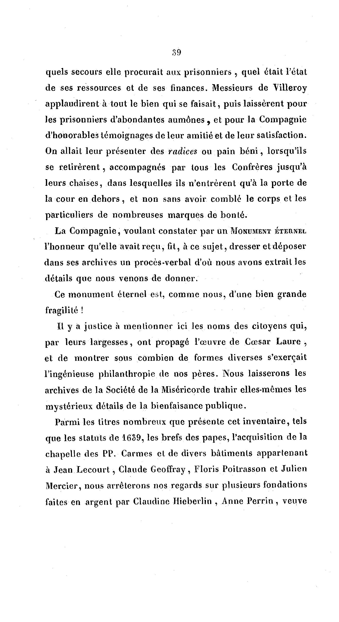 39 quels secours elle procurait aux prisonniers , quel était l'état de ses ressources et de ses finances. Messieurs de Villeroy applaudirent à tout le bien qui se faisait, puis laissèrent pour les prisonniers d'abondantes aumônes , et pour la Compagnie d'honorables témoignages de leur amitié et de leur satisfaction. On allait leur présenter des radiées ou pain béni, lorsqu'ils se retirèrent, accompagnés par tous les Confrères jusqu'à leurs chaises, dans lesquelles ils n'entrèrent qu'à la porte de la cour en dehors, et non sans avoir comblé le corps et les particuliers de nombreuses marqués de bonté. La Compagnie, voulant constater par un MONUMENT ÉTEBNEL l'honneur qu'elle avait reçu, fit, à ce sujet, dresser et déposer dans ses archives un procès-verbal d'où nous avons extrait les détails que nous venons de donner. Ce monument éternel est, comme nous, d'une bien grande fragilité ! Il y a justice à mentionner ici les noms des citoyens qui, par leurs largesses, ont propagé l'œuvre de Cœsar Laure , et de montrer sous combien de formes diverses s'exerçait l'ingénieuse philanthropie de nos pères. Nous laisserons les archives de la Société de la Miséricorde trahir elles-mêmes les mystérieux détails de la bienfaisance publique. Parmi les titres nombreux que présente cet inventaire, tels que les statuts de 1639, les brefs des papes, l'acquisition de la chapelle des PP. Carmes et de divers bâtiments appartenant à Jean Lecourt, Claude Geoffray, Floris Poitrasson et Julien Mercier, nous arrêterons nos regards sur plusieurs fondations faites en argent par Claudine Hieberlin , Anne Perrin, veuve