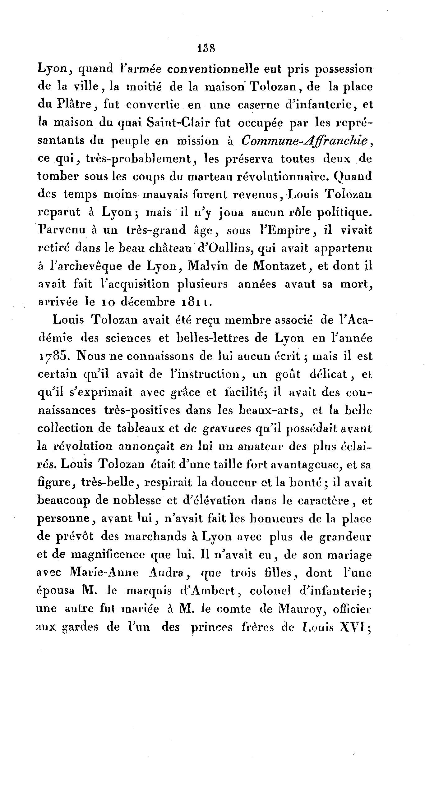 138 Lyon, quand l'armée conventionnelle eut pris possession de la ville, la moitié de la maison Tolozan, de la place du Plâtre, fut convertie en une caserne d'infanterie, et la maison du quai Saint-Clair fut occupée par les repré- sentants du peuple en mission à Commune-Affranchie, ce q u i , très-probablement, les préserva toutes deux de tomber sous les coups du marteau révolutionnaire. Quand des temps moins mauvais furent revenus, Louis Tolozan reparut à Lyon ; mais il n'y joua aucun rôle politique. Parvenu à un très-grand âge, sous l'Empire, il vivait retiré dans le beau château d'Oullins, qui avait appartenu â l'archevêque de Lyon, Mal vin de Montazet, et dont il avait fait l'acquisition plusieurs années avant sa mort, arrivée le 10 décembre 1811. Louis Tolozan avait été reçu membre associé de l'Aca- démie des sciences et belles-lettres de Lyon en l'année 1786. Nous ne connaissons de lui aucun écrit ; mais il est certain qu'il avait de l'instruction, un goût délicat, et qu'il s'exprimait avec grâce et facilité; il avait des con- naissances très-positives dans les beaux-arts, et la belle collection de tableaux et de gravures qu'il possédait avant la l'évolution annonçait en lui un amateur des plus éclai- rés. Louis Tolozan était d'une taille fort avantageuse, et sa figure, très-belle, respirait la douceur et la bonté; il avait beaucoup de noblesse et d'élévation dans le caractère, et personne, avant l u i , n'avait fait les honneurs de la place de prévôt des marchands à Lyon avec plus de grandeur et de magnificence que lui. Il n'avait eu, de son mariage avec Marie-Anne Audra, que trois filles, dont l'une épousa M. le marquis d'Ambert, colonel d'infanterie; une autre fut mariée à M. le comte de Mauroy, officier aux gardes de l'un des princes frères de Louis XVI ;