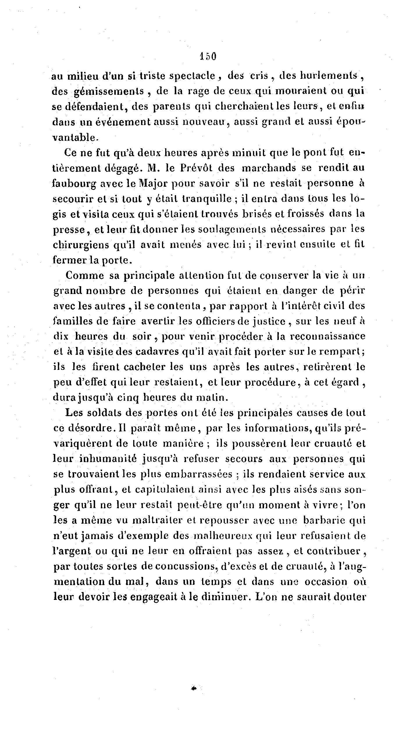 150 au milieu d'un si triste spectacle , des' cris , des hurlements , des gémissements , de la rage de ceux qui mouraient ou qui se défendaient, des parents qui cherchaient les leurs, et enfin dans un événement aussi nouveau, aussi grand et aussi épou- vantable. Ce ne fut qu'à deux heures après minuit que le pont fut en- tièrement dégagé. M. le Prévôt des marchands se rendit au faubourg avec le Major pour savoir s'il ne restait personne à secourir et si tout y était tranquille ; il entra dans tous les lo- gis et visita ceux qui s'étaient trouvés brisés et froissés dans la presse, et leur fit donner les soulagements nécessaires par les chirurgiens qu'il avait menés avec lui ; il revint ensuite et fil fermer la porte. Comme sa principale attention fut de conserver la vie à un grand nombre de personnes qui étaient en danger de périr avec les autres , il se contenta, par rapport à l'intérêt civil des familles de faire avertir les officiers de justice , sur les neuf à dix heures du s o i r , pour venir procéder à la reconnaissance et à la visite des cadavres qu'il avait fait porter sur le rempart ; ils les firent cacheter les uns après les autres, retirèrent le peu d'effet qui leur restaient, et leur procédure, à cet égard , dura jusqu'à cinq heures du matin. Les soldats des portes ont été les principales causes de tout ce désordre. Il paraît m ê m e , par les informations, qu'ils p r é - variquèrent de toute manière ; ils poussèrent leur cruauté et leur inhumanité jusqu'à refuser secours aux personnes qui se trouvaient les plus embarrassées ; ils rendaient service aux plus offrant, et capitulaient ainsi avec les plus aisés sans son- ger qu'il ne leur restait peut-être qu'un moment à vivre; l'on les a même vu maltraiter et repousser avec une barbarie qui n'eut jamais d'exemple des malheureux qui leur refusaient de l'argent ou qui ne leur en offraient pas assez , et contribuer, par toutes sortes de concussions, d'excès et de cruauté, à l'aug- mentation du mal, dans un temps et dans uno occasion où leur devoir les engageait à le diminuer. L'on ne saurait douter