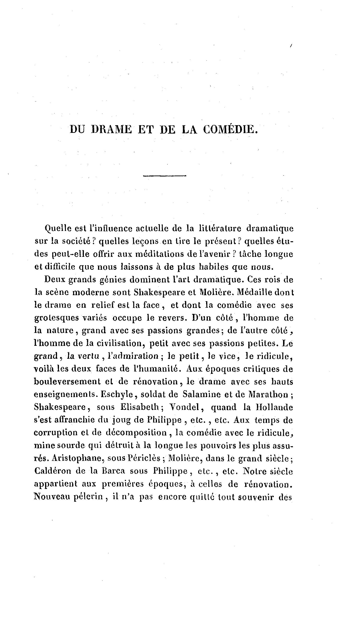 DU DRAME ET DE LA COMÉDIE. Quelle est l'influence actuelle de la littérature dramatique sur la société? quelles leçons en lire le présent? quelles étu- des peut-elle offrir aux méditations de l'avenir ? tâche longue et difficile que nous laissons à de plus habiles que nous. Deux grands génies dominent l'art dramatique. Ces rois de la scène moderne sont Shakespeare et Molière. Médaille dont le drame en relief est la face , et dont la comédie avec ses grotesques variés occupe le revers. D'un côté, l'homme de la nature, grand avec ses passions grandes; de l'autre côté, l'homme de la civilisation, petit avec ses passions petites. Le grand, la vertu , l'admiration ; le petit, le vice, le ridicule, voilà les deux faces de l'humanité. Aux époques critiques de bouleversement el de rénovation, le drame avec ses hauts enseignements. Eschyle, soldat de Salamine et de Marathon ; Shakespeare, sous Elisabeth; Vondel, quand la Hollande s'est affranchie du joug de Philippe , etc., etc. Aux temps de corruption el de décomposition, la comédie avec le ridicule, mine sourde qui détruit à la longue les pouvoirs les plus assu- rés. Aristophane, sous Périclès ; Molière, dans le grand siècle ; Caldéron de la Barca sous Philippe, etc., elc. Notre siècle appartient aux premières époques, à celles de rénovation. Nouveau pèlerin , il n'a pas encore quille tout souvenir des