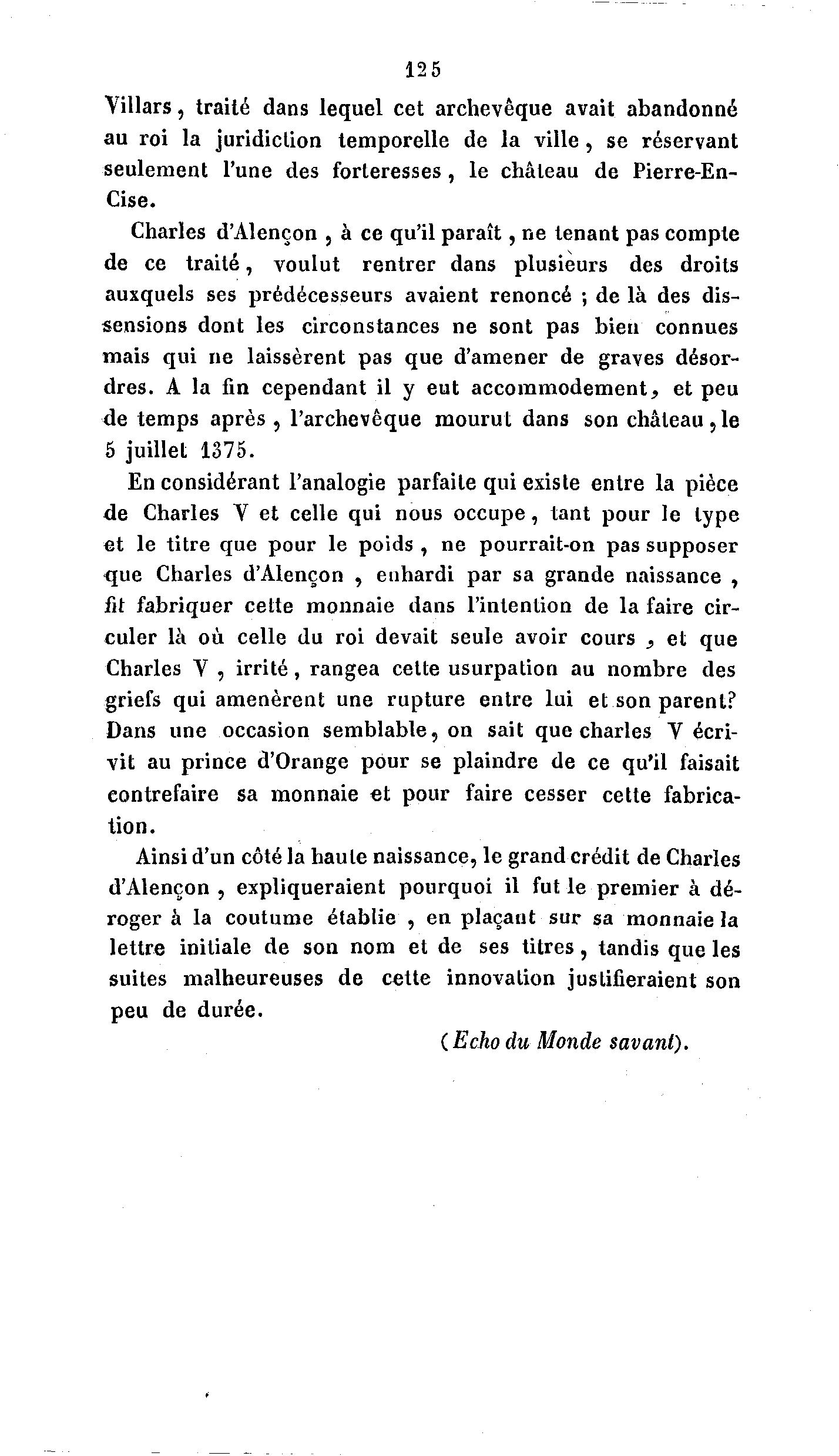 125 Yillars, traité dans lequel cet archevêque avait abandonné au roi la juridiction temporelle de la ville , se réservant seulement l'une des forteresses , le château de Pierre-En- Cise. Charles d'Alençon , à ce qu'il paraît, ne tenant pas compte de ce traité, voulut rentrer dans plusieurs des droits auxquels ses prédécesseurs avaient renoncé ; de là des dis- sensions dont les circonstances ne sont pas bien connues mais qui ne laissèrent pas que d'amener de graves désor- dres. A la fin cependant il y eut accommodement, et peu de temps après , l'archevêque mourut dans son château, le 5 juillet 1375. En considérant l'analogie parfaite qui existe entre la pièce de Charles Y et celle qui nous occupe, tant pour le type et le titre que pour le poids , ne pourrait-on pas supposer que Charles d'Alençon , enhardi par sa grande naissance , fit fabriquer cette monnaie dans l'intention de la faire cir- culer là où celle du roi devait seule avoir cours , et que Charles Y , irrité, rangea cette usurpation au nombre des griefs qui amenèrent une rupture entre lui et son parent? Dans une occasion semblable, on sait que charles Y écri- vit au prince d'Orange pour se plaindre de ce qu'il faisait contrefaire sa monnaie et pour faire cesser cette fabrica- tion. Ainsi d'un côté la haute naissance, le grand crédit de Charles d'Alençon , expliqueraient pourquoi il fut le premier à dé- roger à la coutume établie , en plaçant sur sa monnaie la lettre initiale de son nom et de ses titres, tandis que les suites malheureuses de cette innovation justifieraient son peu de durée. (.Echodu Monde savant).