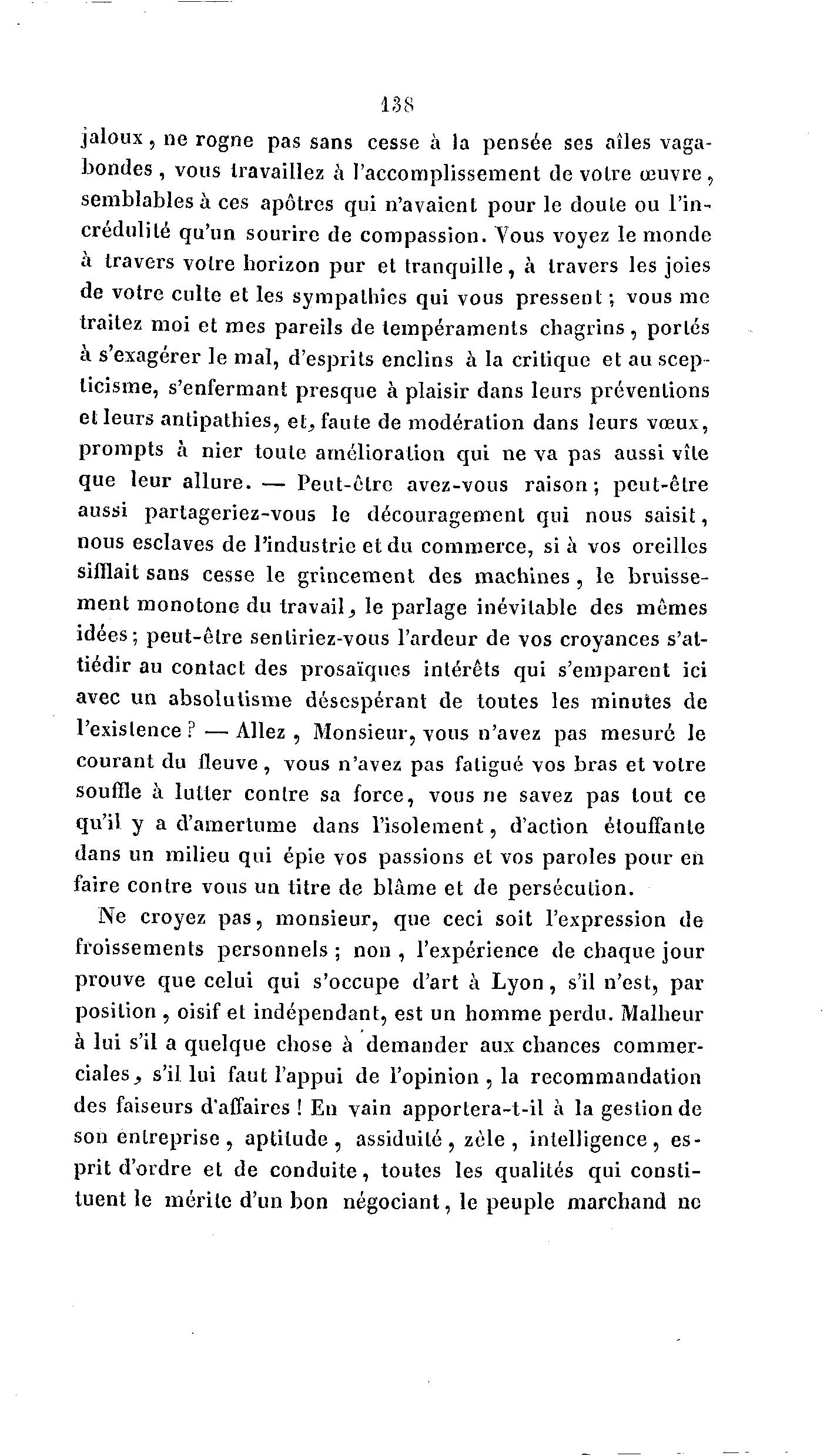 138 jaloux, ne rogne pas sans cesse à ia pensée ses aîles vaga- bondes , vous travaillez à l'accomplissement de votre œ u v r e , semblables à ces apôtres qui n'avaient pour le doute ou l'in- crédulité qu'un sourire de compassion. Yous voyez le monde a travers votre horizon pur et tranquille, à travers les joies de votre culte et les sympathies qui vous pressent ; vous me traitez moi et mes pareils de tempéraments chagrins, portés à s'exagérer le mal, d'esprits enclins à la critique et au scep- ticisme, s'enfermant presque à plaisir dans leurs préventions et leurs antipathies, et^ faute de modération dans leurs vœux, prompts à nier toute amélioration qui ne va pas aussi vite que leur allure. — Peut-être avez-vous raison; peut-être aussi partageriez-vous le découragement qui nous saisit, nous esclaves de l'industrie et du commerce, si à vos oreilles sifflait sans cesse le grincement des machines , le bruisse- ment monotone du travail^ le parlage inévitable des mêmes idées; peut-être senliriez-vous l'ardeur de vos croyances s'at- tiédir au contact des prosaïques intérêts qui s'emparent ici avec un absolutisme désespérant de toutes les minutes de l'existence ? — Allez , Monsieur, vous n'avez pas mesuré le courant du fleuve, vous n'avez pas fatigué vos bras et votre souffle à lutter contre sa force, vous ne savez pas tout ce qu'il y a d'amertume dans l'isolement, d'action étouffante dans un milieu qui épie vos passions et vos paroles pour en faire contre vous un titre de blâme et de persécution. Ne croyez p a s , monsieur, que ceci soit l'expression de froissements personnels ; non , l'expérience de chaque jour prouve que celui qui s'occupe d'art à L y o n , s'il n'est, par position , oisif et indépendant, est un homme perdu. Malheur à lui s'il a quelque chose à demander aux chances commer- ciales^ s'il lui faut l'appui de l'opinion, la recommandation des faiseurs d'affaires ! En vain apportera-t-il à la gestion de son entreprise , aptitude, assiduité , zèle , intelligence, es- prit d'ordre et de conduite, toutes les qualités qui consti- tuent le mérite d'un bon négociant, le peuple marchand ne