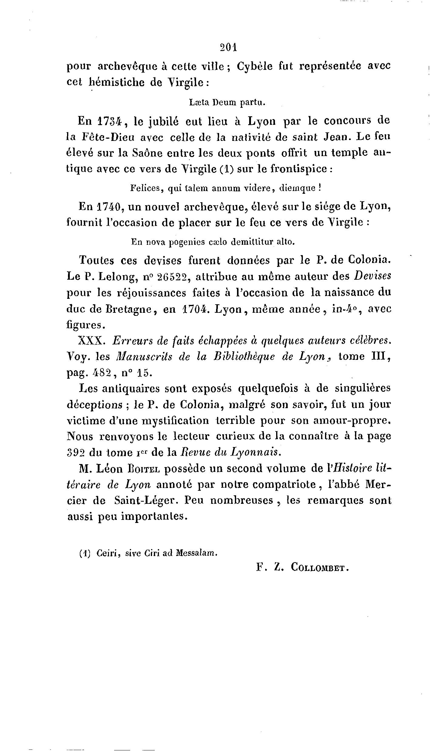 201 pour archevêque à cette ville ; Cybèle fut représentée avec cet hémistiche de "Virgile : Lœta Deum partu. En 1734, le jubilé eut lieu à Lyon par le concours de la Fête-Dieu avec celle de la nativité de saint Jean. Le feu élevé sur la Saône entre les deux ponts offrit un temple an- tique avec ce vers de Virgile (1) sur le frontispice : Felices, qui lalem annum videre, diemque ! En 1740, un nouvel archevêque, élevé sur le siège de Lyon, fournit l'occasion de placer sur le feu ce vers de Virgile : En nova pogenies ca;lo demillitur alto. Toutes ces devises furent données par le P. de Colonia. Le P. Lelong, n° 26522, attribue au même auteur des Devises pour les réjouissances faites à l'occasion de la naissance du duc de Bretagne, en 1704. Lyon, même année, in-4°, avec figures. XXX. Erreurs de faits échappées à quelques auteurs célèbres. Voy. les Manuscrits de la Bibliothèque de Lyon, tome III, pag. 482, n° 15. Les antiquaires sont exposés quelquefois à de singulières déceptions ; le P. de Colonia, malgré son savoir, fut un jour victime d'une mystification terrible pour son amour-propre. Nous renvoyons le lecteur curieux de la connaître à la page 392 du tome icr de la Revue du Lyonnais. M. Léon EOITEL possède un second volume de l'Histoire lit- téraire de Lyon annoté par notre compatriote, l'abbé Mer- cier de Saint-Léger. Peu nombreuses , les remarques sont aussi peu importantes. (1) Ceiri, sive Ciri ad Messalam. F . Z. COLLOMBET.