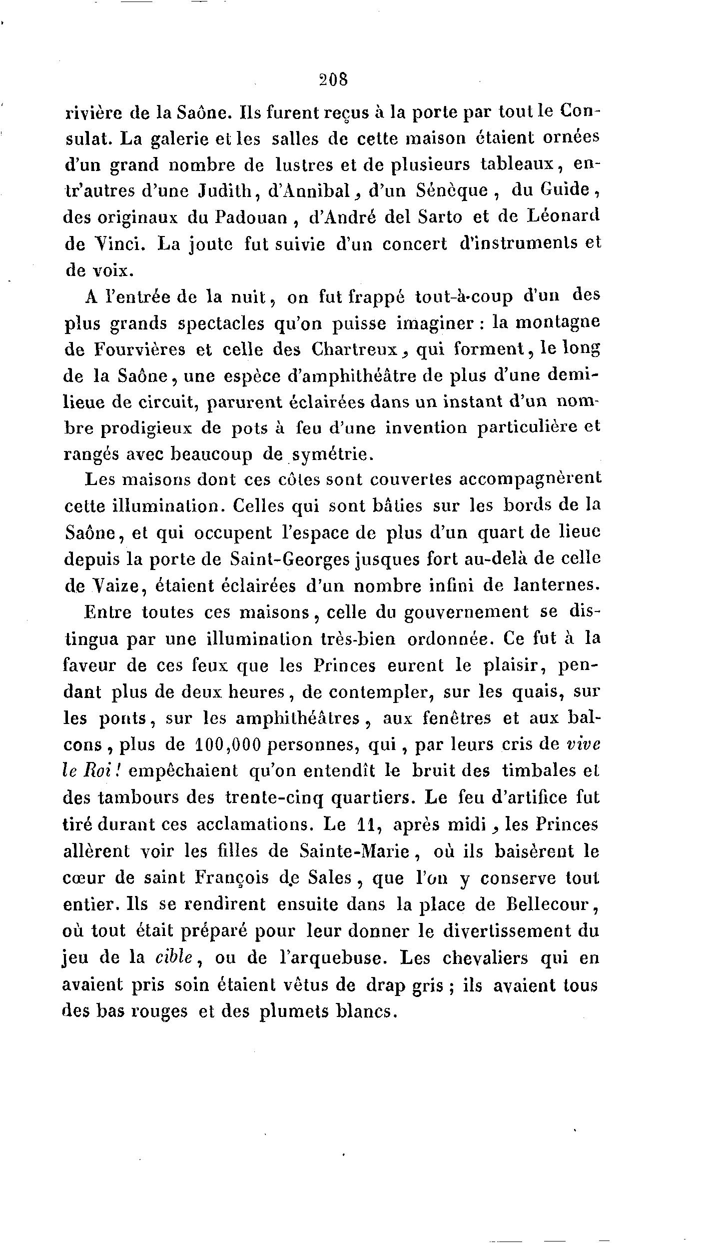 208 rivière de la Saône. Ils furent reçus à la porte par tout le Con- sulat. La galerie et les salles de cette maison étaient ornées d'un grand nombre de lustres et de plusieurs tableaux, en- tr'autres d'une Judith, d'Annibal., d'un Sénôque , du Guide, des originaux du Padouan , d'André del Sarto et de Léonard de Yinci. La joute fut suivie d'un concert d'instruments et de voix. A l'entrée de la n u i t , on fut frappé tout-à -coup d'un des plus grands spectacles qu'on puisse imaginer : la montagne de Fourvières et celle des Chartreux, qui forment, le long de la Saône, une espèce d'amphithéâtre de plus d'une demi- lieue de circuit, parurent éclairées dans un instant d'un nom- bre prodigieux de pots à feu d'une invention particulière et rangés avec beaucoup de symétrie. Les maisons dont ces côtes sont couvertes accompagnèrent cette illumination. Celles qui sont bâties sur les bords de la Saône, et qui occupent l'espace de plus d'un quart de lieue depuis la porte de Saint-Georges jusques fort au-delà de celle de Vaize, étaient éclairées d'un nombre infini de lanternes. Entre toutes ces maisons, celle du gouvernement se dis- tingua par une illumination très-bien ordonnée. Ce fut à la faveur de ces feux que les Princes eurent le plaisir, pen- dant plus de deux heures, de contempler, sur les quais, sur les p o n t s , sur les amphithéâtres, aux fenêtres et aux bal- cons , plus de 100,000 personnes, q u i , par leurs cris de vive le Roi! empêchaient qu'on entendît le bruit des timbales et des tambours des trente-cinq quartiers. Le feu d'artifice fut tiré durant ces acclamations. Le 11, après midi , les Princes allèrent voir les filles de Sainte-Marie, où ils baisèrent le cœur de saint François d.e Sales , que l'on y conserve tout entier. Ils se rendirent ensuite dans la place de Bellecour, où tout était préparé pour leur donner le divertissement du jeu de la cible, ou de l'arquebuse. Les chevaliers qui en avaient pris soin étaient vêtus de drap gris ; ils avaient tous des bas rouges et des plumets blancs.