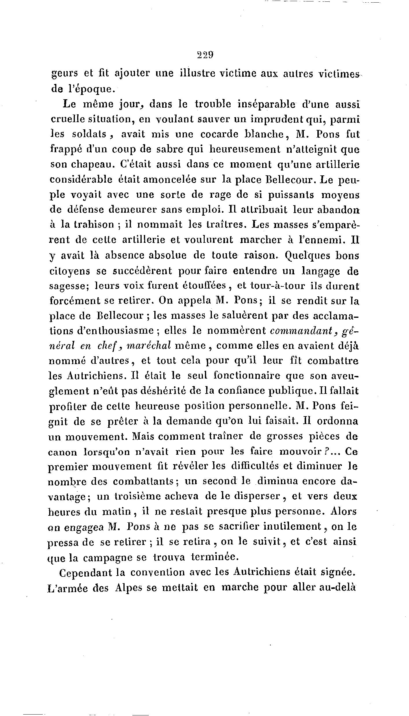 229 geurs et fit ajouter une illustre victime aux autres victimes de l'époque. Le même jour, dans le trouble inséparable d'une aussi cruelle situation, en voulant sauver un imprudent qui, parmi les soldats, avait mis une cocarde blanche, M. Pons fut frappé d'un coup de sabre qui heureusement n'atteignit que son chapeau. C'était aussi dans ce moment qu'une artillerie considérable était amoncelée sur la place Bellecour. Le peu- ple voyait avec une sorte de rage de si puissants moyens de défense demeurer sans emploi. Il attribuait leur abandon; à la trahison ; il nommait les traîtres. Les masses s'emparè- rent de celte artillerie et voulurent marcher à l'ennemi. Il y avait là absence absolue de toute raison. Quelques bons citoyens se succédèrent pour faire entendre un langage de sagesse; leurs voix furent étouffées, et tour-à -tour ils durent forcément se retirer. On appela M. Pons; il se rendit sur la place de Bellecour ; les masses le saluèrent par des acclama- tions d'enthousiasme ; elles le nommèrent commandant, gé- néral en chef, maréchal même , comme elles en avaient déjà nommé d'autres, et tout cela pour qu'il leur fît combattre les Autrichiens. Il était le seul fonctionnaire que son aveu- glement n'eût pas déshérité de la confiance publique. Il fallait profiter de celte heureuse position personnelle. M. Pons fei- gnit de se prêter à la demande qu'on lui faisait. II ordonna un mouvement. Mais comment traîner de grosses pièces de canon lorsqu'on n'avait rien pour les faire mouvoir?... Ce premier mouvement fit révéler les difficultés et diminuer le nombre des combattants; un second le diminua encore da- vantage; un troisième acheva de le disperser, et vers deux heures du m a t i n , il ne restait presque plus personne. Alors on engagea M. Pons à ne pas se sacrifier inutilement; on le pressa de se retirer ; il se retira , on le suivit, et c'est ainsi que la campagne se trouva terminée. Cependant la convention avec les Autrichiens était signée. L'armée des Alpes se mettait en marche pour aller au-delÃ