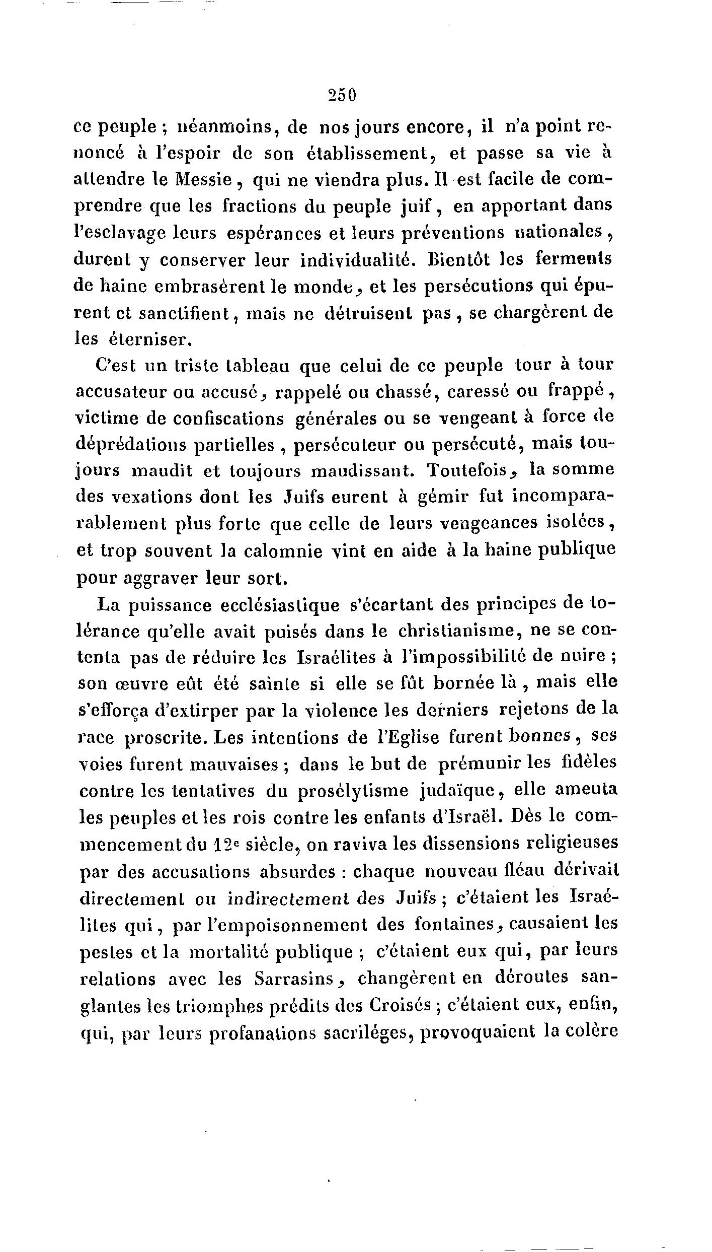 250 ce peuple ; néanmoins, de nos jours encore, il n'a point re- noncé à l'espoir de son établissement, et passe sa vie à attendre le Messie , qui ne viendra plus. Il est facile de com- prendre que les fractions du peuple juif, en apportant dans l'esclavage leurs espérances et leurs préventions nationales , durent y conserver leur individualité. Bientôt les ferments de haine embrasèrent le m o n d e , et les persécutions qui épu- rent et sanctifient, mais ne détruisent pas , se chargèrent de les éterniser. C'est un triste tableau que celui de ce peuple tour à tour accusateur ou accusé, rappelé ou chassé, caressé ou frappé, victime de confiscations générales ou se vengeant à force de déprédations partielles , persécuteur ou persécuté, mais tou- jours maudit et toujours maudissant. Toutefois, la somme des vexations dont les Juifs eurent à gémir fut incompara- rablement plus forte que celle de leurs vengeances isolées, et trop souvent la calomnie vint en aide à la haine publique pour aggraver leur sort. La puissance ecclésiastique s'écartant des principes de t o - lérance qu'elle avait puisés dans le christianisme, ne se con- tenta pas de réduire les Israélites à l'impossibilité de nuire ; son œuvre eût été sainle si elle se fût bornée là , mais elle s'efforça d'extirper par la violence les derniers rejetons de la l'ace proscrite. Les intentions de l'Eglise furent b o n n e s , ses voies furent mauvaises ; dans le but de prémunir les fidèles contre les tentatives du prosélytisme judaïque, elle ameuta les peuples et les rois contre les enfanls d'Israël. Dès le com- mencement du 12 e siècle, on raviva les dissensions religieuses par des accusalions absurdes : chaque nouveau fléau dérivait directement ou indirectement des Juifs ; c'étaient les Israé- lites q u i , par l'empoisonnement des fontaines, causaient les pestes et la mortalité publique ; c'étaient eux q u i , par leurs relations avec les Sarrasins, changèrent en déroutes san- glantes les triomphes prédits des Croisés ; c'étaient eux, enfin, qui, par leurs profanations sacrilèges, provoquaient la colère